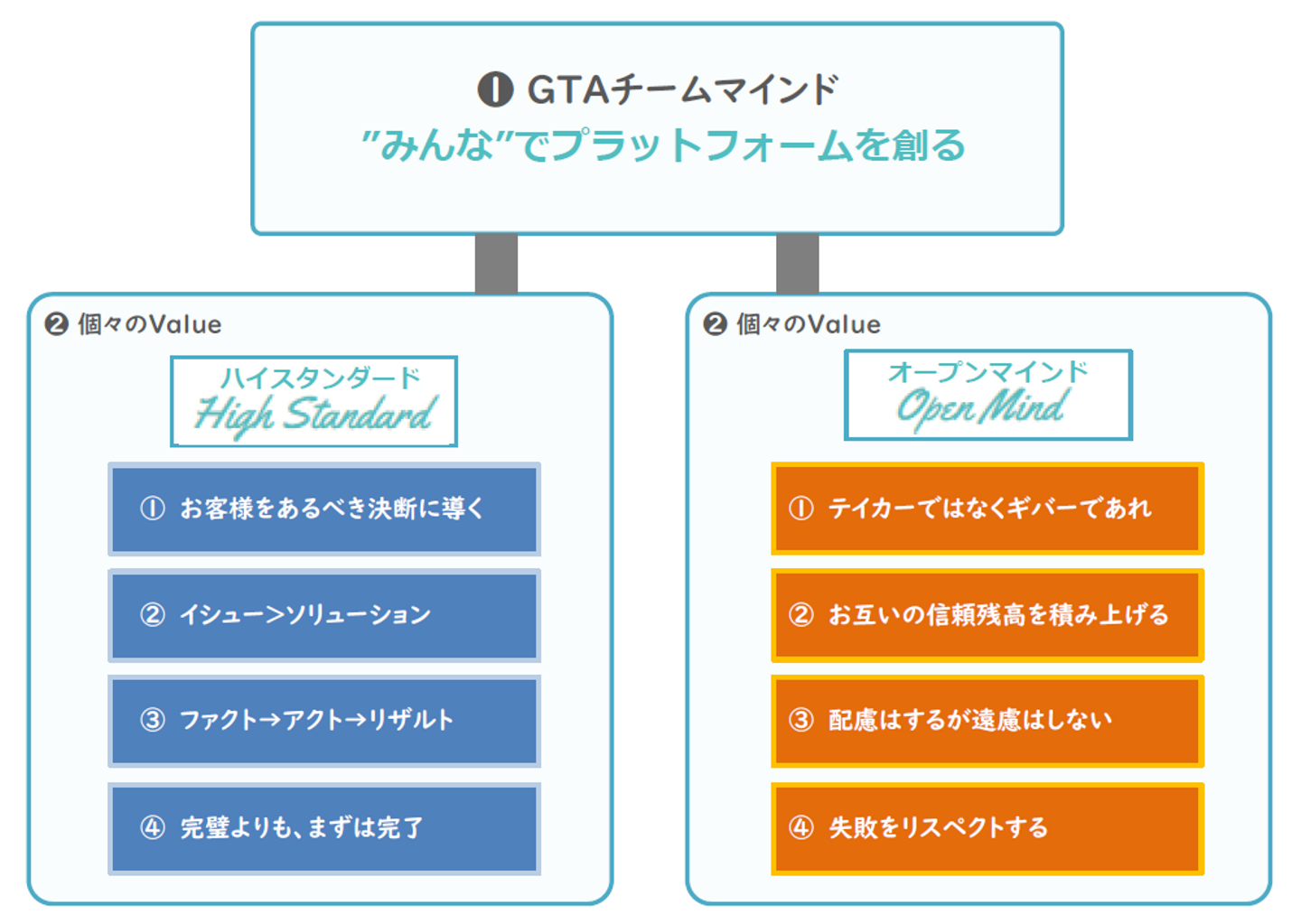 このミッションとビジョンを実現するために、組織的な価値観・行動規範となるのがバリューです。私たちのバリューは、1つのチームマインドと8つの個人マインドで構成されています。