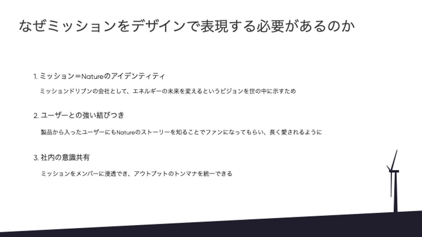 私たちNatureがミッションをデザインで表現する理由は上記の3つからだと考えていて、具体的にどのようなことをしたかお話しさせていただきます。