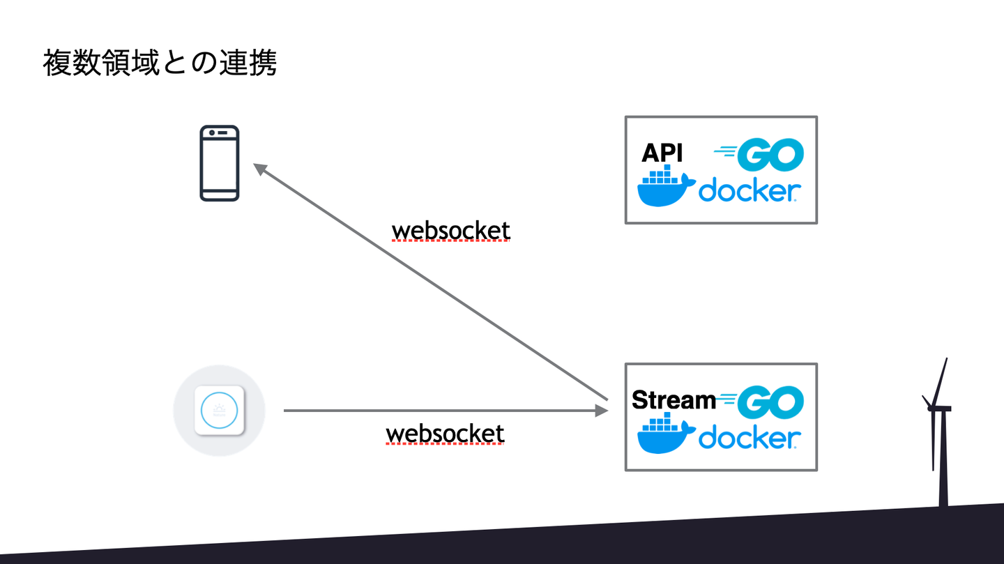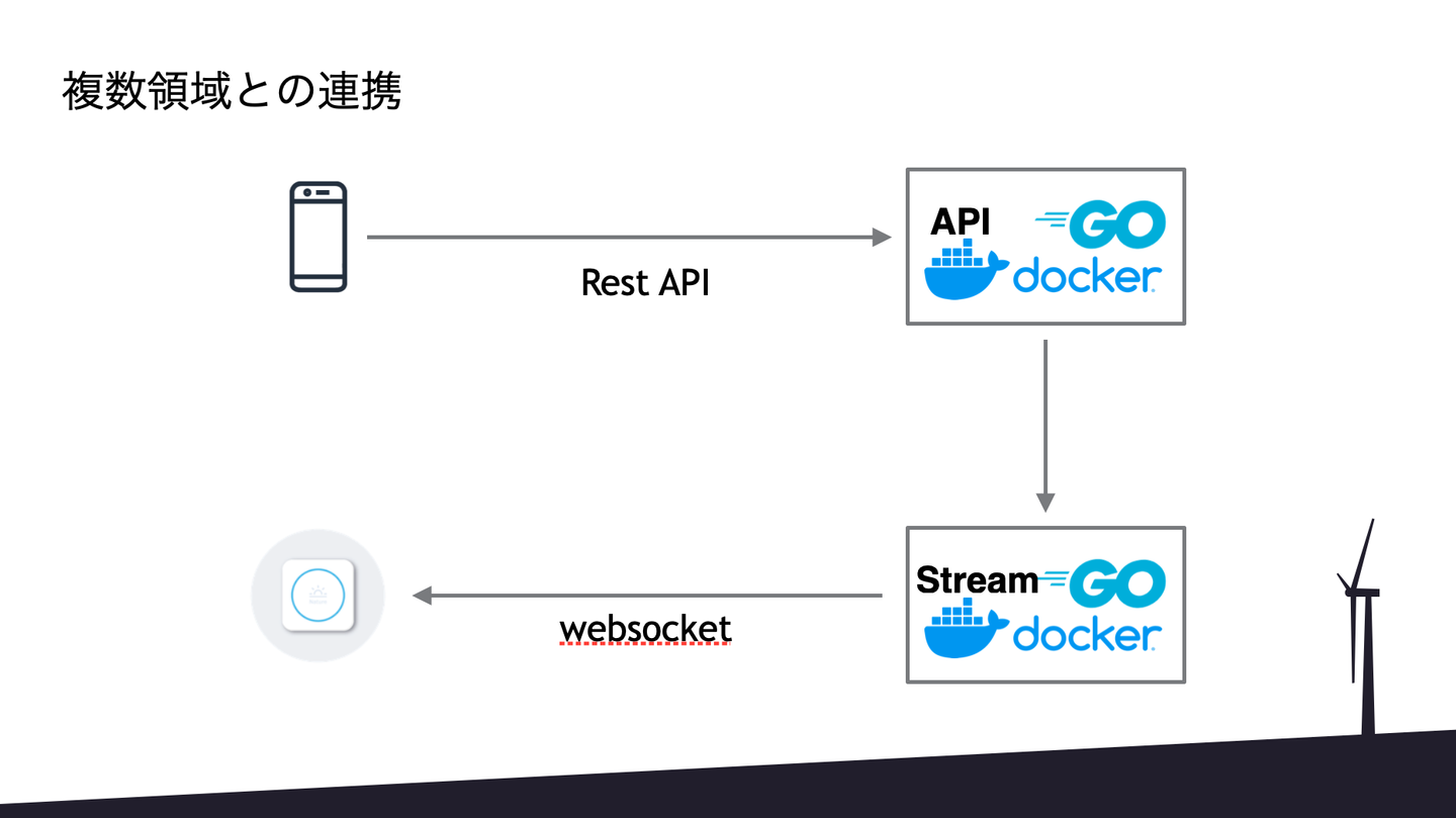 亀田:ただ、これだけではなくて、逆にエアコンをつけた結果をアプリに通知するためにストリームサーバーにいってゴニョゴニョしてアプリ側にWebソケットで戻ってくる。これはアプリ開発ではないデータの流れになっています。スマートフォンからRest APIの結果が回り回ってWebソケット経由でアプリに戻ってくる。
