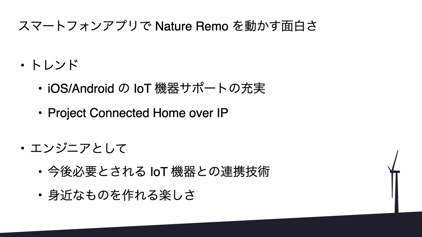 亀田:では、僕からは「Natureにおけるアプリ開発について」LTを始めて行きたいと思います。余談ですが、川崎さんのお話を聞いていて、Nature Remoを触るとAndroidやiOSのデバイスがセンサーの塊だとおっしゃっていて、僕も同じように思っていたので、なんだか嬉しくなりました(笑)。