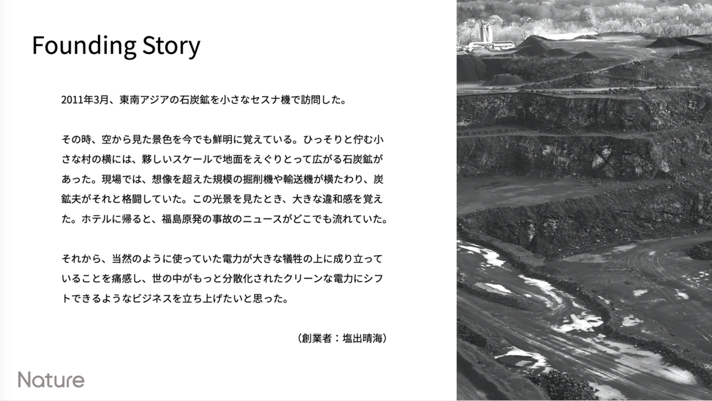 塩出:弊社はIoTのスマートリモコンを開発販売している会社というイメージが強いと思いますが、これらの事業をスタートさせた原体験は、電力にあります。僕は元々総合商社の三井物産で電力領域の事業開発に携わっていました。このスライドのFounding Storyの通り、その当時現場で感じた違和感から、電力をクリーンエネルギーだけでまかなえるような世界を作りたいと思い、Natureをスタートしました。