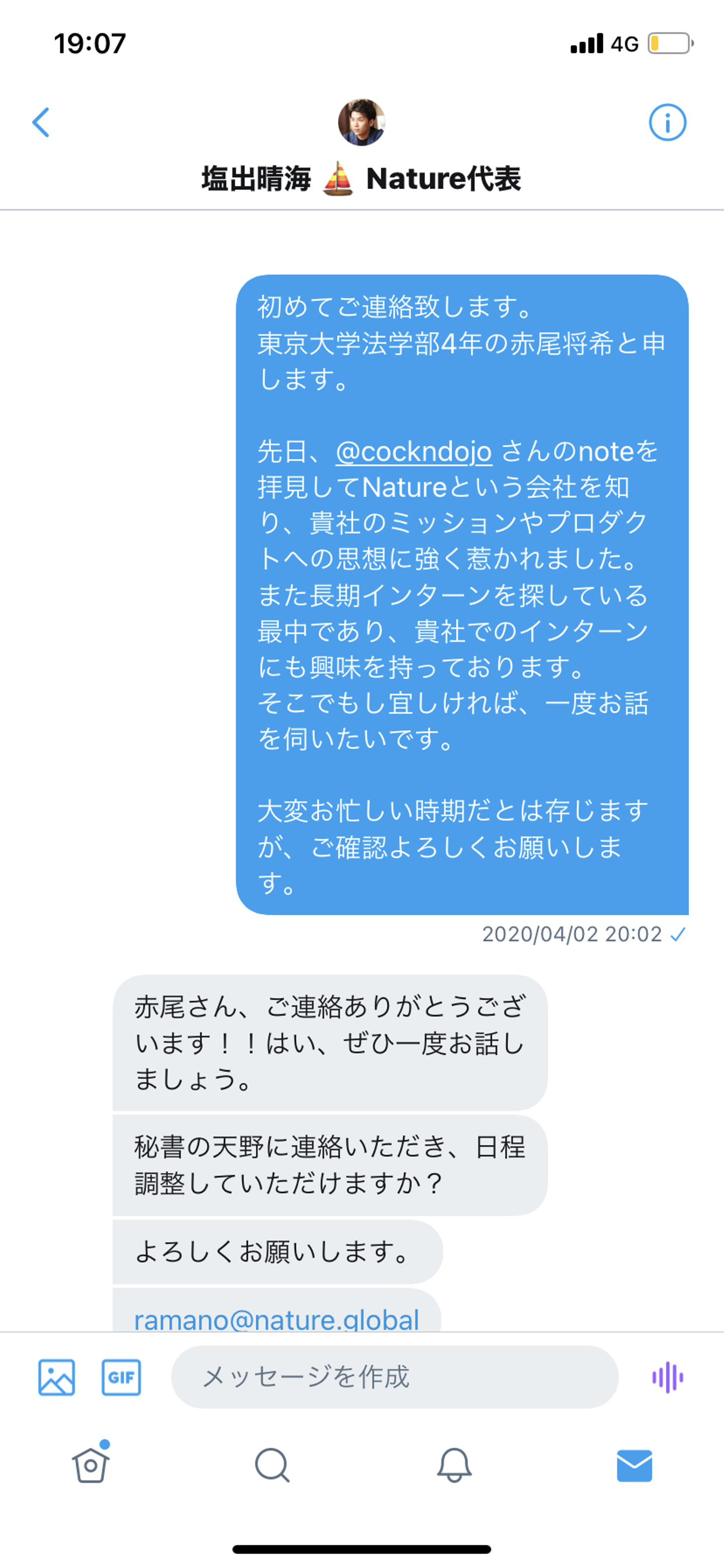 そこで、このビジョン・組織のことをもっと知りたい!インターンしたい!という欲求から、塩出にDMを送りました。