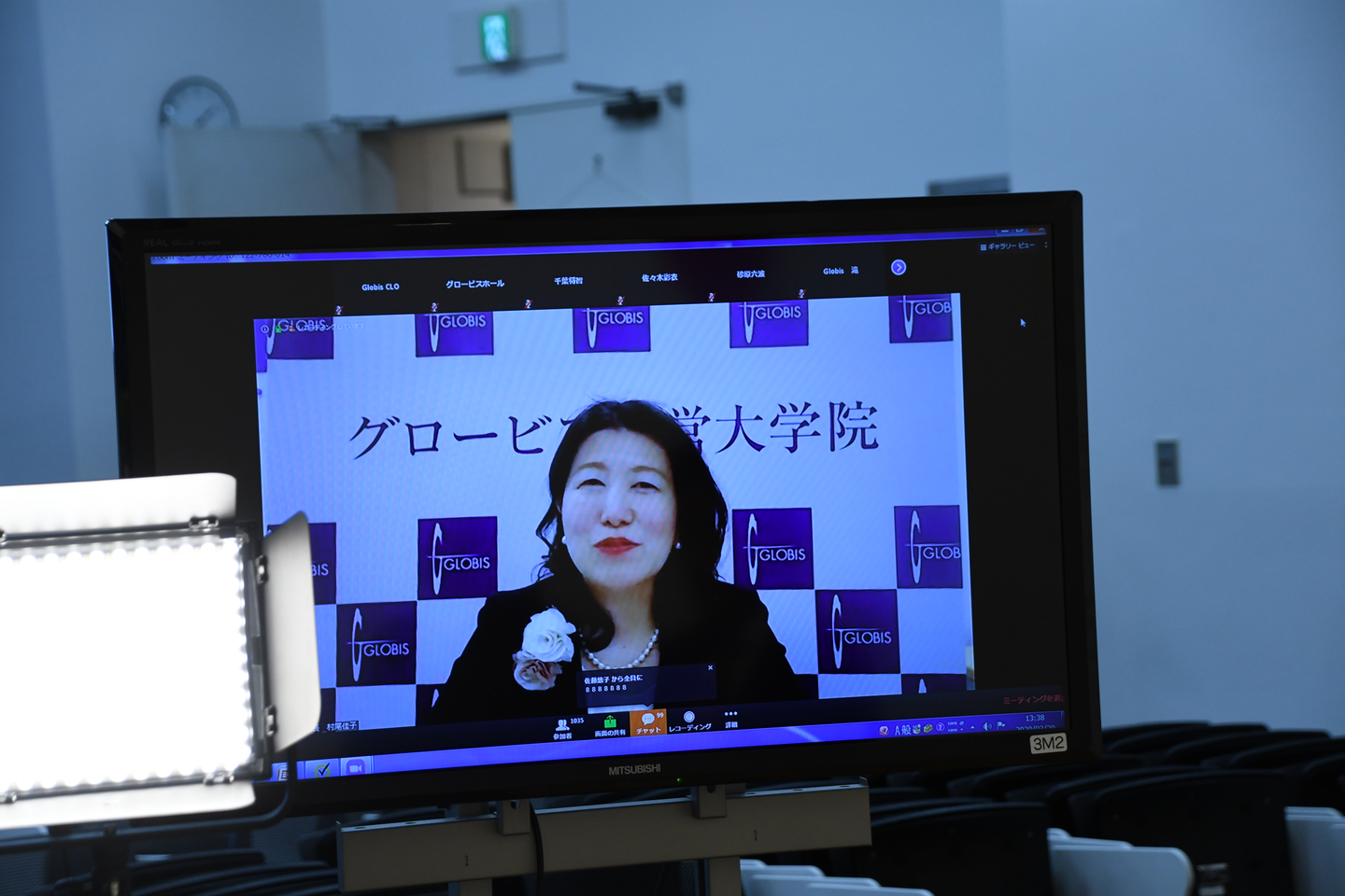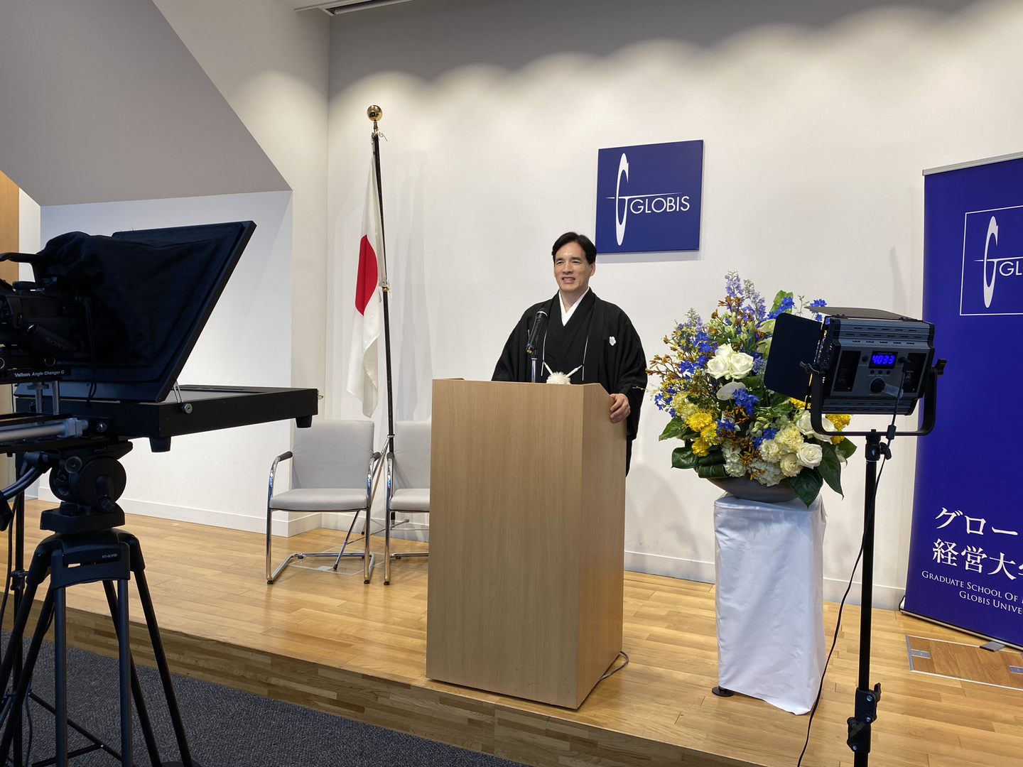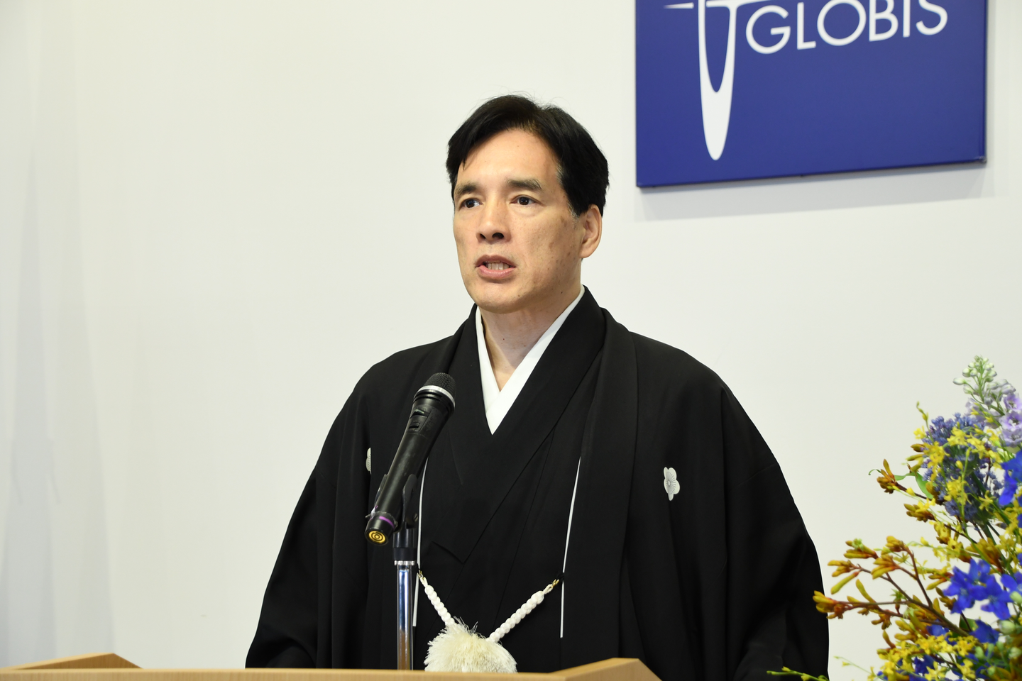 「1つ目は、グロービスが提供する『能力開発』『人的ネットワーク構築』『志の醸成』の場を最大限活用すること。 2つ目は、リスクを取り『創造と変革』を成し遂げる姿勢を身に付けること。3つ目は、世界観・歴史観・倫理観・人生観・使命感という『5カン』を持って、 リーダーとしての意思決定を行うことを期待しています。」と述べました。