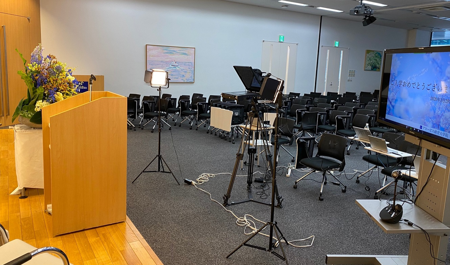 例年、入学式はキャンパス毎に実施してきましたが、本年度の入学式は、国内外における新型コロナウイルス感染症の影響拡大に鑑み、初となる全拠点合同・オンラインによる開催となりました。東京校の入学式を開催するだけでも、いつも大きなプレッシャーを感じていましたが、今回は全キャンパス1,000人を超える新入生やご家族の期待を一身に背負うこととなり、いつも以上に緊張感が高まります💦