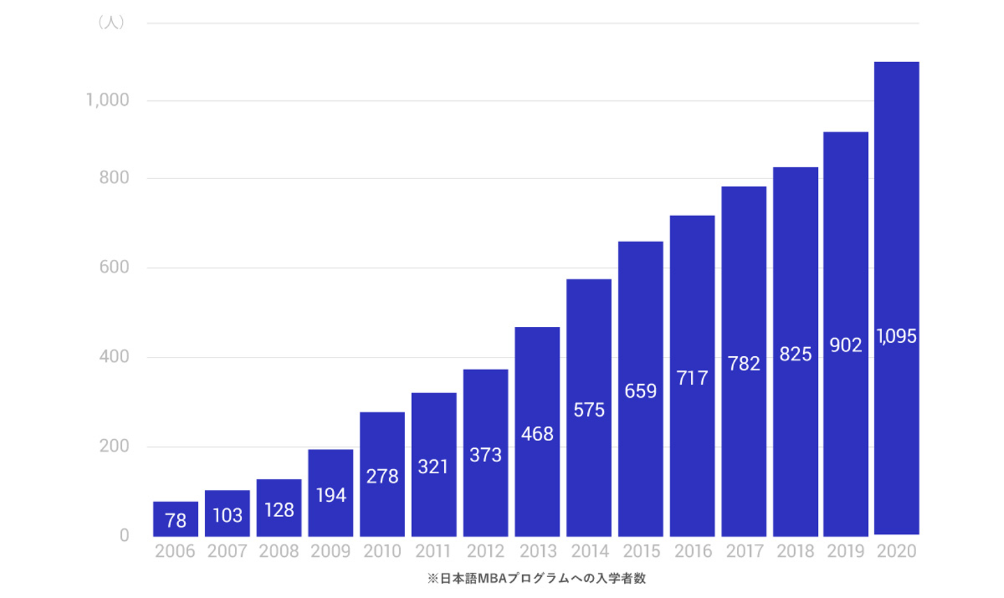 東京、大阪、名古屋、仙台、福岡の5キャンパスとオンラインを合せた入学者数は今年も過去最多の計1,095名に達し、日本最大のビジネススクールに成長しています。近年では、医師や弁護士などの専門資格職、エンジニアやデザイナーなどのクリエイティブ職、NPO職員や公益財団職員などの非営利職、 またプロスポーツ選手などの入学者も見られ、学生の多様性は急速に増しています。
