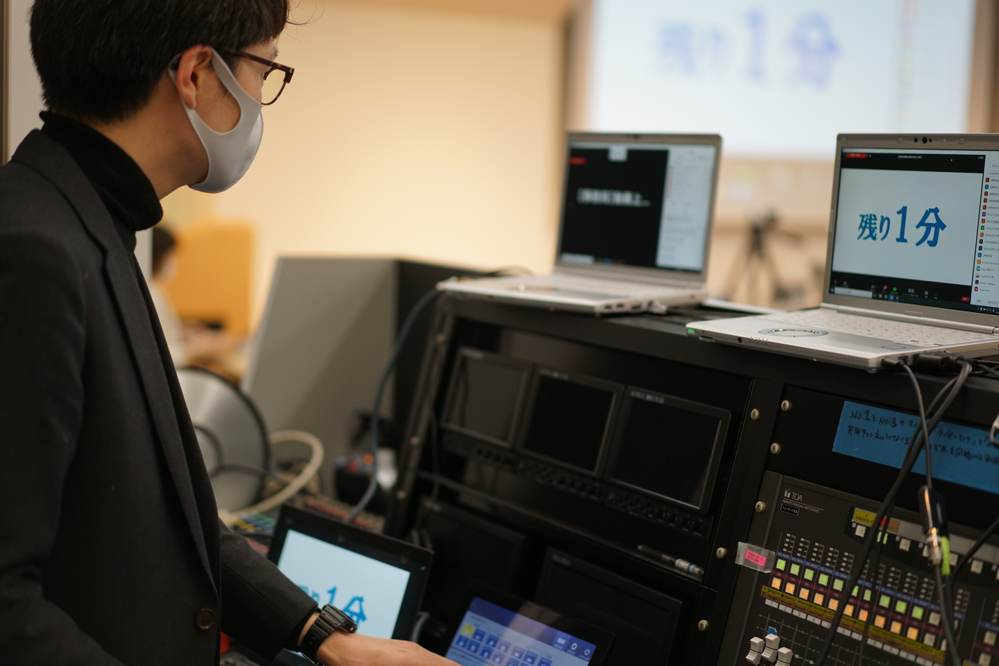カメラ操作だけでなく、音響機器の操作もスタッフが対応します。オープニング動画の再生やプレゼン中の操作を繰り返し確認、リハーサルを実施しました。