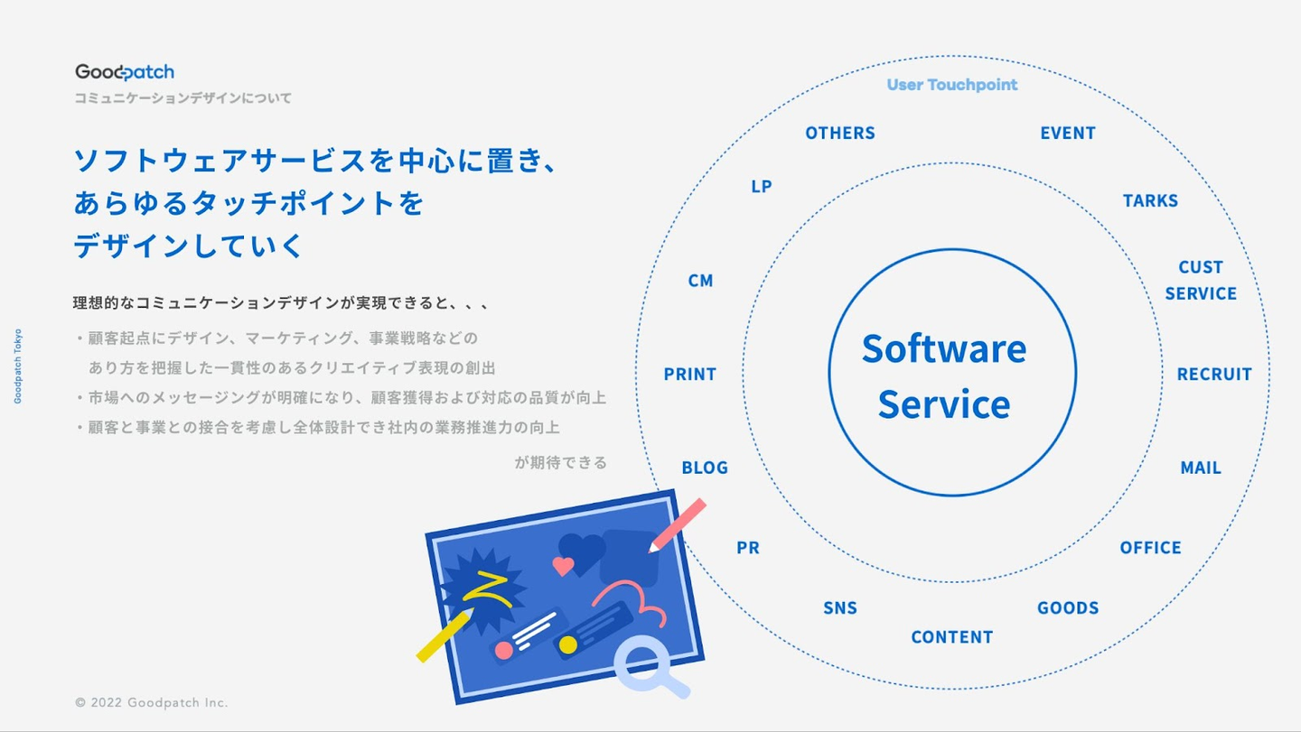 Goodpatchでは、コミュニケーションデザインを “ソフトウェアデザインも含めたサービスを中心に置いたときに、その周りにあるタッチポイントをデザインしていくこと” と定義しています。