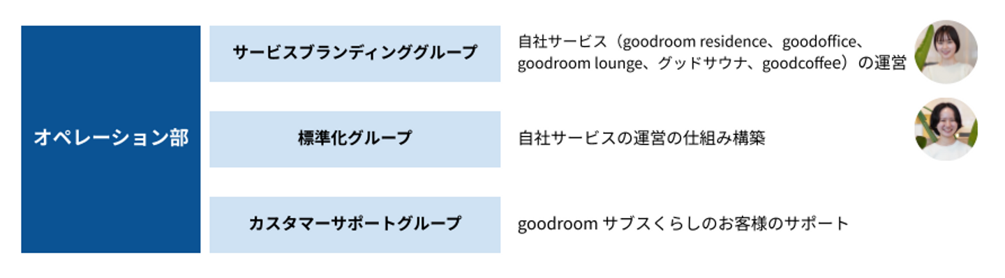 T.H: SBグループの役割を一言で表すと、グッドルームのサービスをエンドユーザーに届けること。goodroom residence(住まい)やgoodoffice(シェアオフィス)、goodroom lounge(コワーキングオフィス)、グッドサウナ(サウナ)、goodcoffee(カフェ)などの自社物件の運営を担い、サービス品質向上、施設の集客向上、継続率の向上を目指しています。