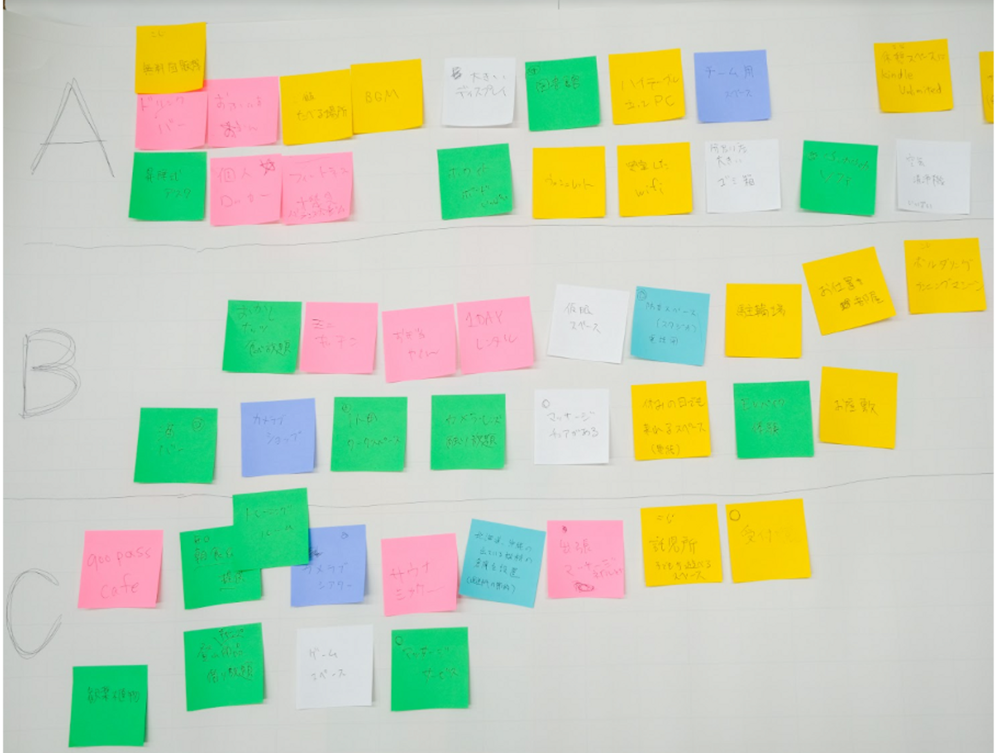 カメラブは2022年に移転が決定していることから、「出社したくなるオフィスはどのようなところか」をAからCまで優先順位を付けて意見出しをおこないました。