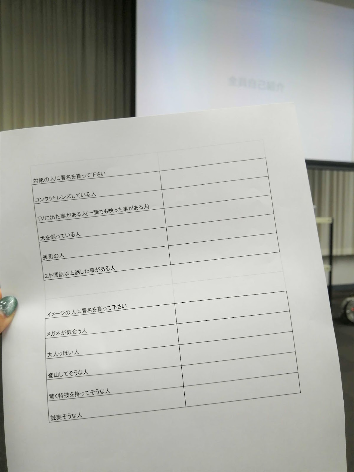 渡された用紙にはそれぞれ異なる質問が書かれています。「コンタクトレンズをしている人」、「犬を飼っている人」。直接話を聞かないと分からない質問ばかりです。まだお互いのことを知らない状態で、必然的に話す機会となります。