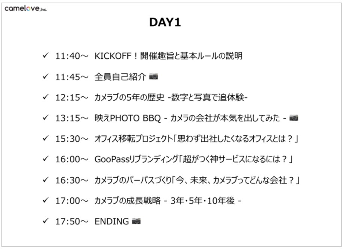 今回開催された2021年度のオフサイトミーティングでは、企業やサービス理解を深めるインプット、メンバー同士の交流機会を創出するカメラブならではのコンテンツを用意しました。