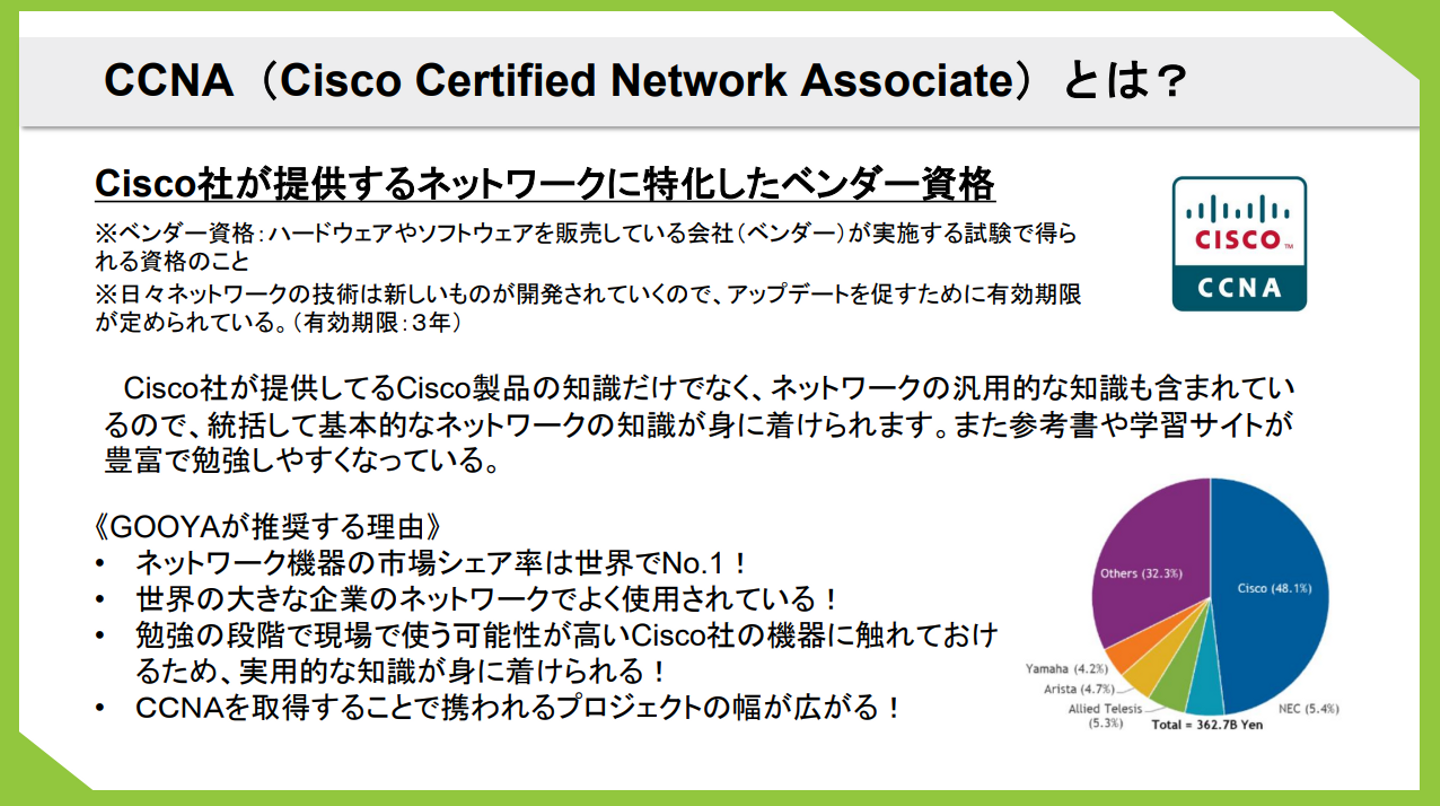 ~インフラエンジニア必見の資格~CCNAを取得していることで参加できるようになるプロジェクトもあるため、GOOYAではプロジェクトの幅を広げるためにもCCNAの取得を強く推奨しています!