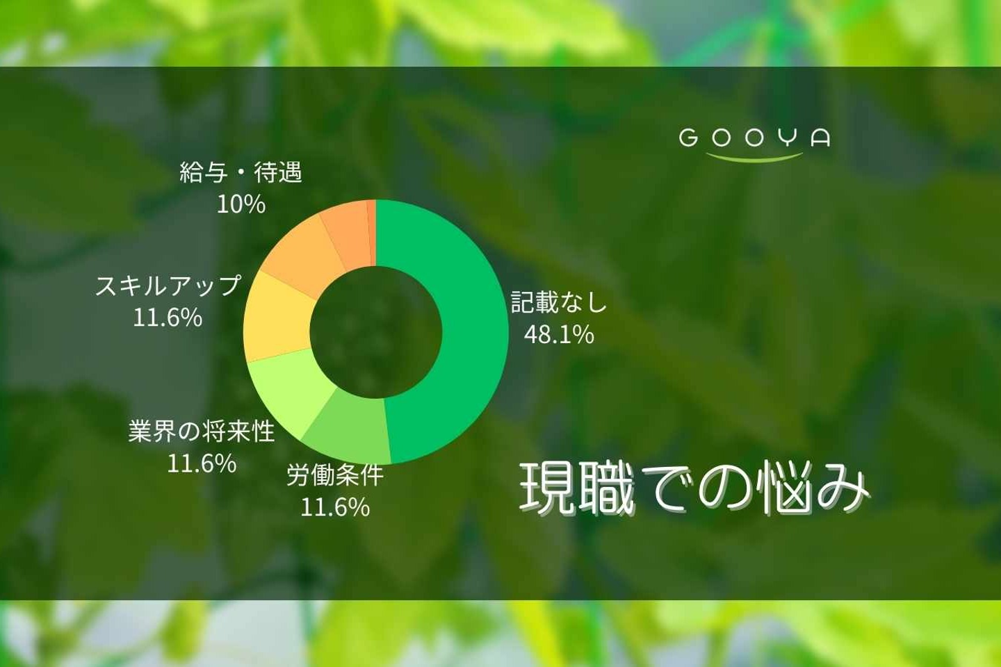人間関係に関しては、ご本人の価値観やコミュニケーション能力に依存する要素も多いため、一概にITエンジニアであれば解消される!とは言いにくい部分ではありますが、次項の現職のお悩みの集計を見ると、GOOYAへ入社された方は解消されているケースが多いようです!