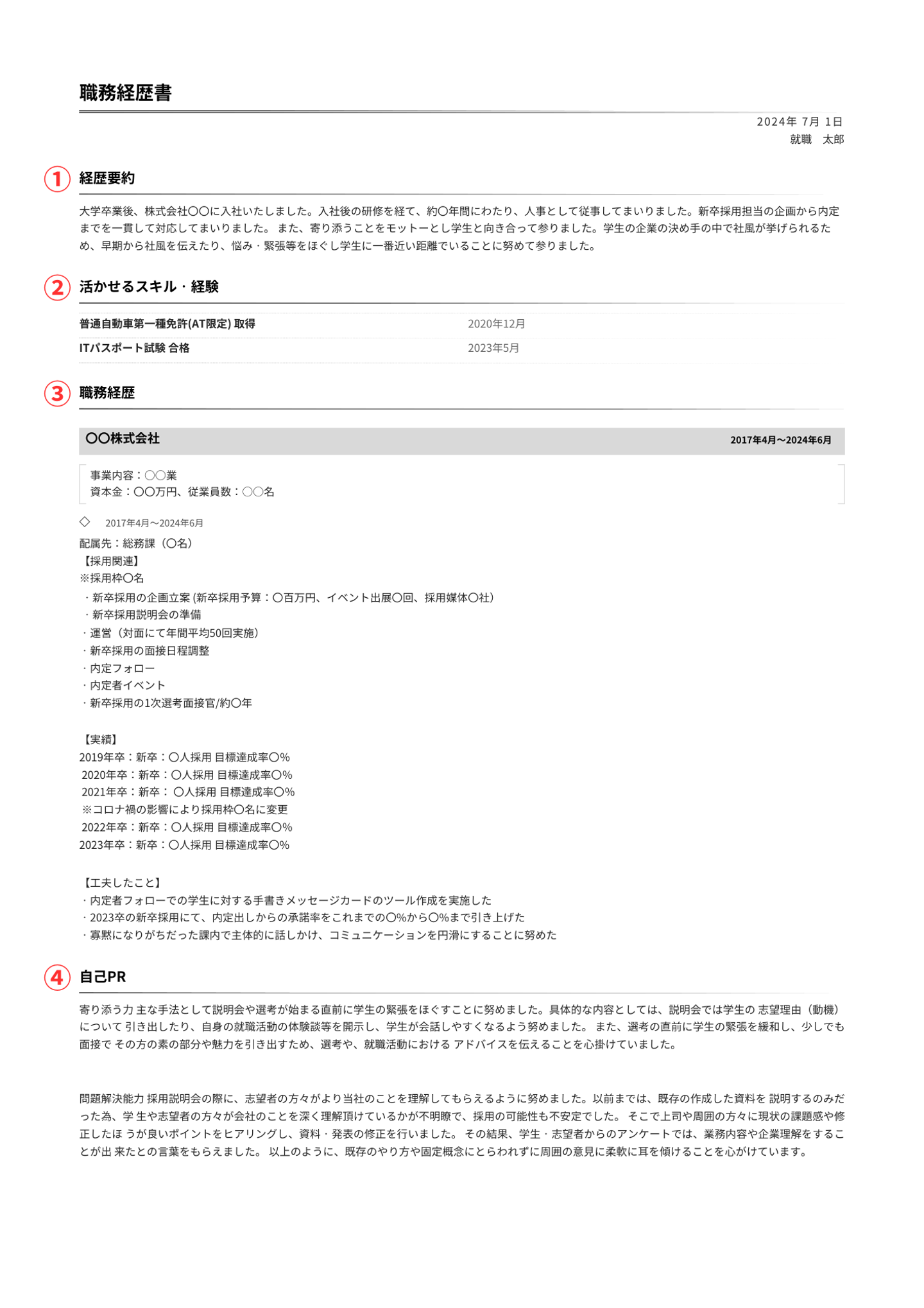 職歴::企業名、部署、役職、在籍期間などを具体的に記入します。