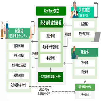 東京都ではGovTech東京と保活に関する情報連携基盤を構築し、民間保活アプリや保育ICTと連携することによって、保育園探しから入園までの手続がオンラインで完結するワンストップシステムの実現を目指しています。