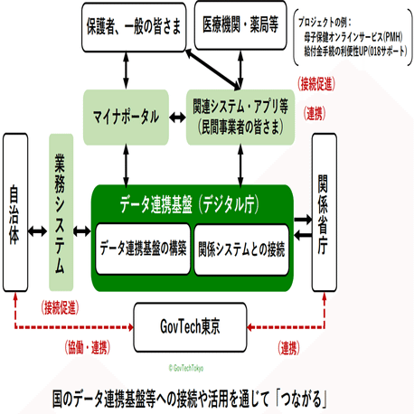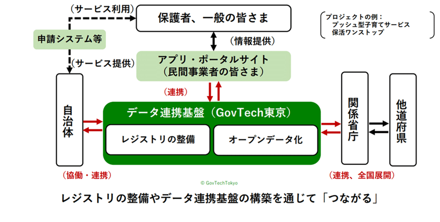 こどもDXをはじめとして、手続きのワンストップ化やレジストリ・データ連携基盤の構築に向けて、関係団体・民間事業者の皆さまと連携し(官民連携)、都内の区市町村との連携、さらに全国展開等を見据えて関係省庁等とも連携しながら(官官連携)、プロジェクトを推進しています。