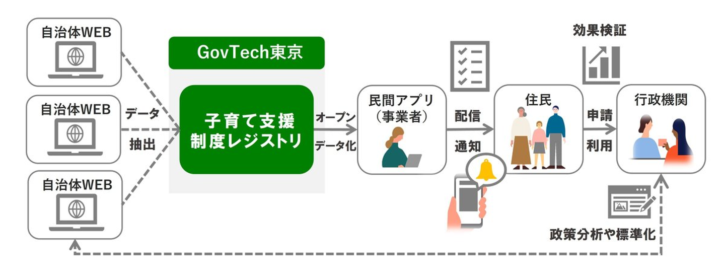国が掲げている全国的なレジストリの整備やプッシュ型子育て支援も見据えながら、先行プロジェクトとしてGovTech東京が東京都版子育て支援制度レジストリを整備し、東京都オープンデータカタログサイトに順次公開しています。民間事業者の皆さまにオープンデータを活用いただき、アプリ利用者のニーズに応じた給付金等の最適な情報を配信します。