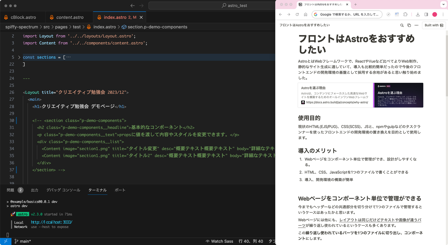 入社当初は基本のHTML、CSS、jQueryしか使えなかったスタッフも、日々の学習が発揮され、最近ではJavaScriptやVue.js、Astro、WebGLなどの技術を使用してWebサイト制作をおこなっています。
