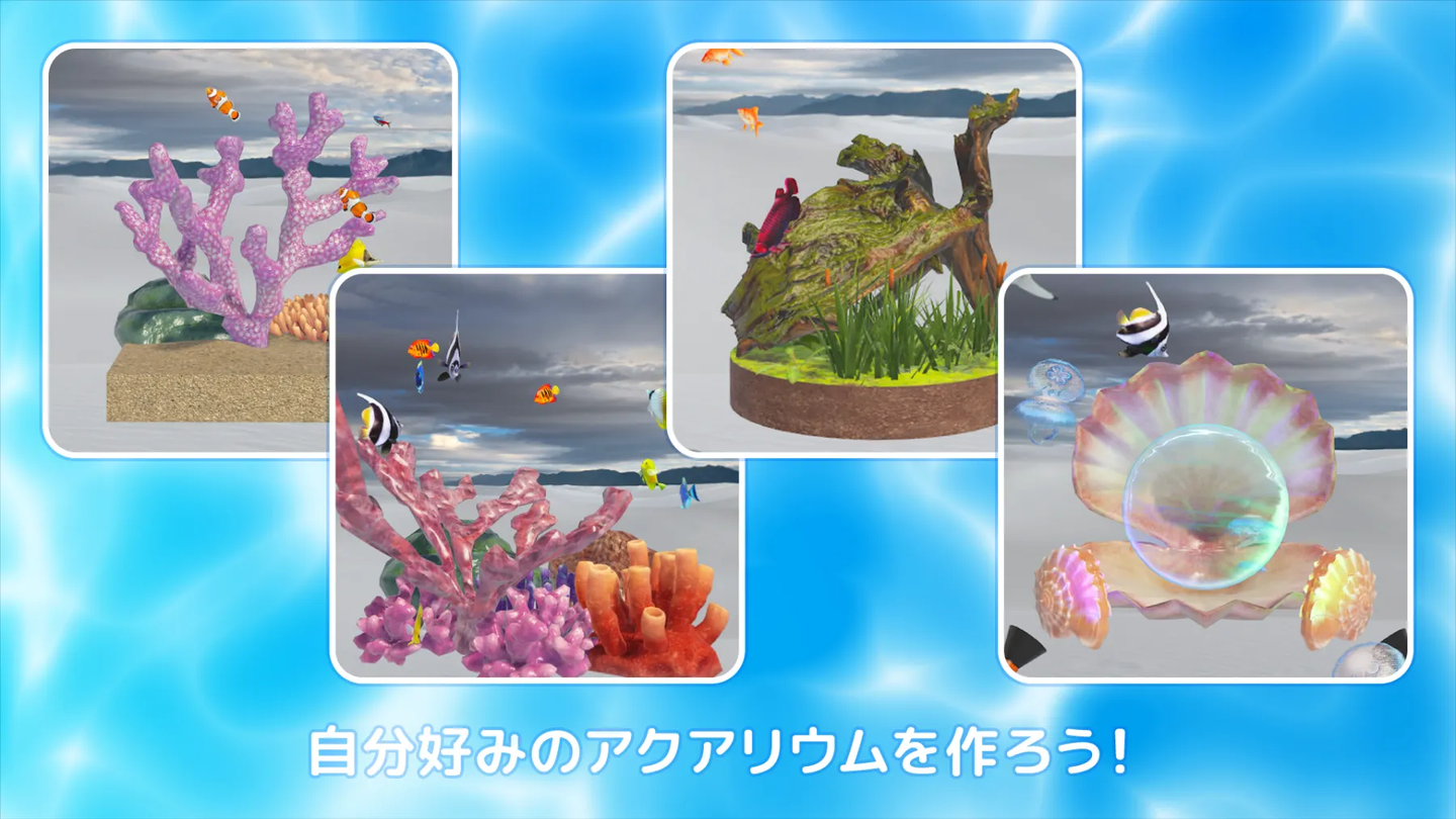 さまざまなアイテムや魚を配置して自分だけのアクアリウムを創ることができます。現実では実現が難しいレイアウトにも挑戦でき、自由な発想でアクアリウム創りを楽しむことができます。