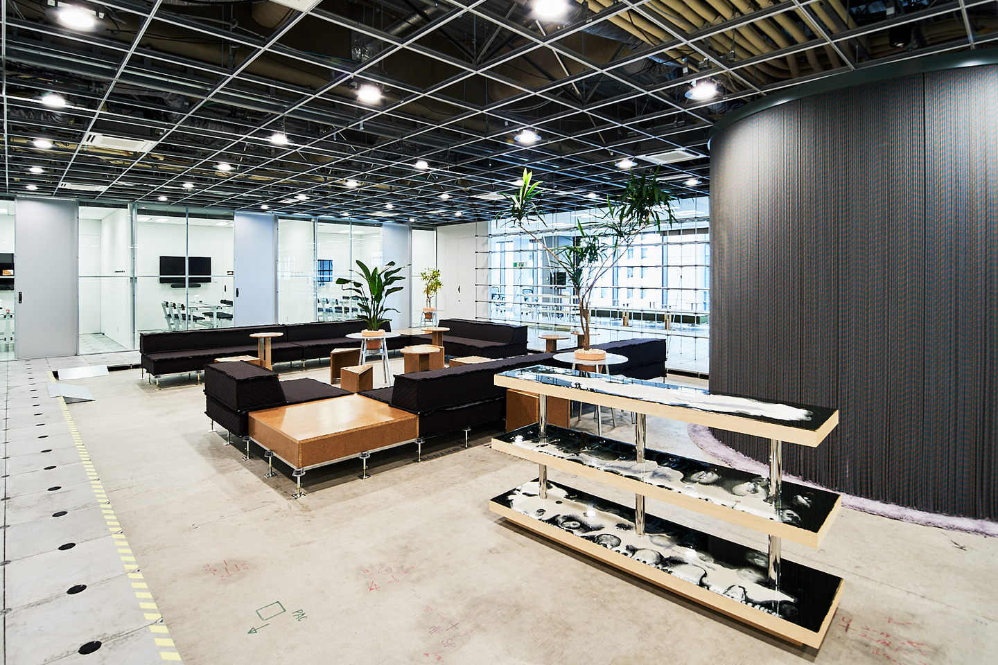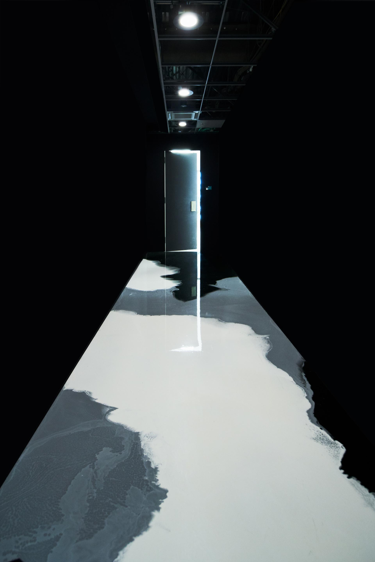 この作品の横にあるドアを開けると、三方が黒く塗られ、床一面が顔料を混ぜた樹脂でできた通路に繋がります。4階と3階を分断することなく繋がる仕掛けとして重力を意識した通路、ちょうど3階の真下には同じ樹脂でできたハイテーブルが配置されていて連動感を演出しました。