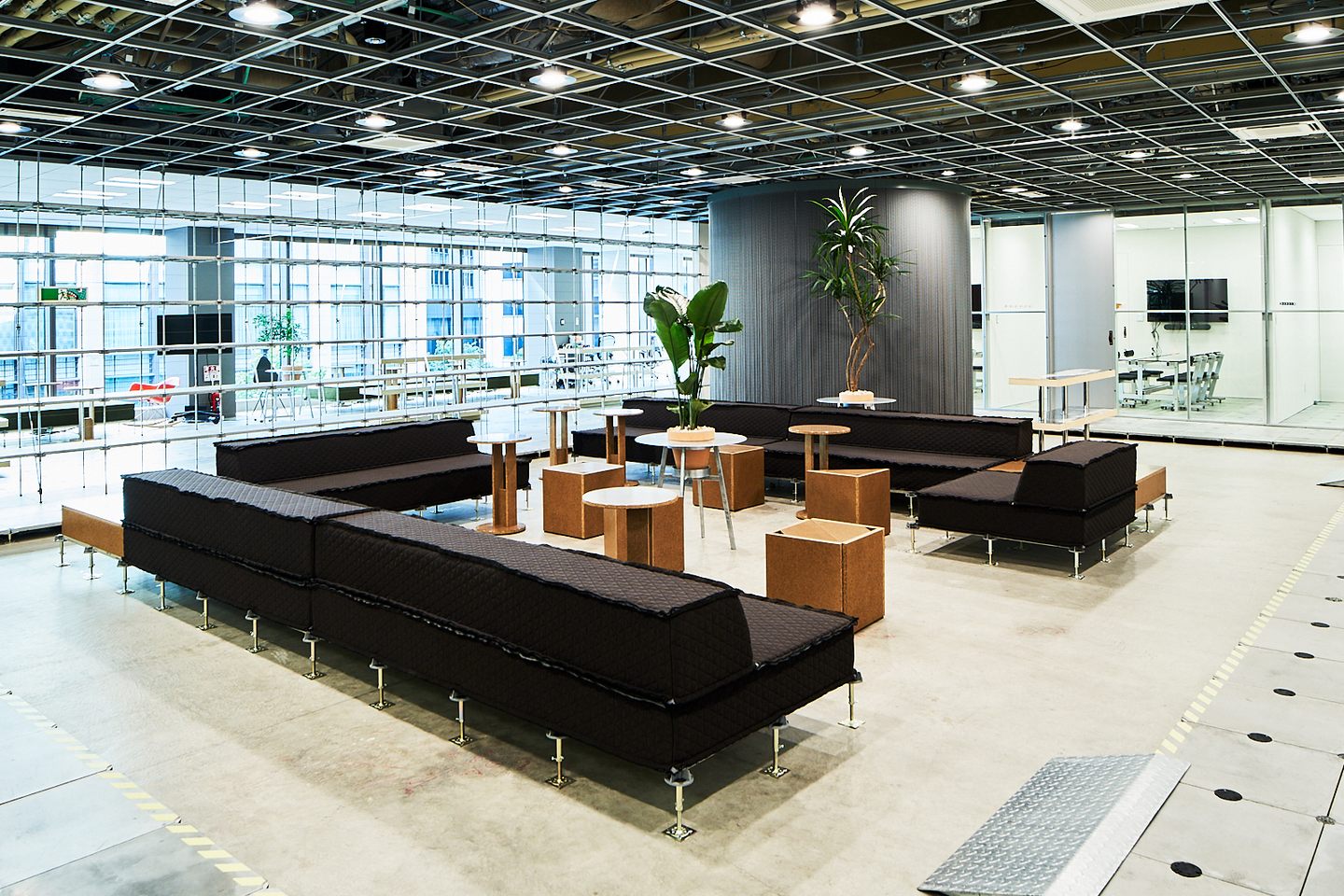 ▲OAフロアを再利用したソファ。空間を仕切っている左側の什器にもOAフロアを使用している。