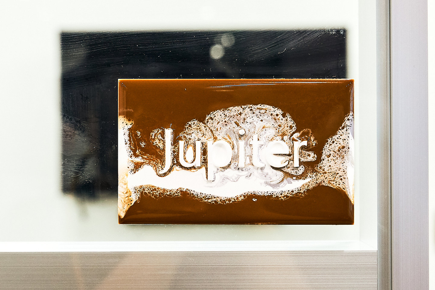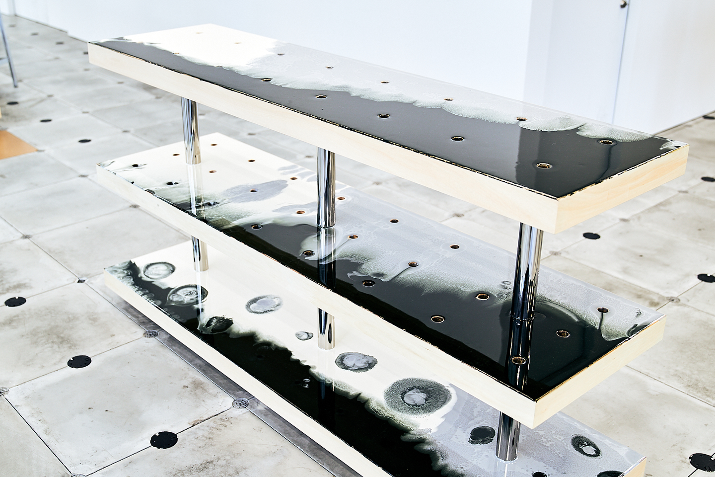 これは、重力によって生み出されたデザイン。どういうことかというと、ハイテーブルの天板には穴が空いているので、最上段に顔料を混ぜた樹脂を垂らすと、重力によってぽたぽたと上段から下段に落ちていきます。樹脂の硬化速度がゆっくりなので、じわりと色が混ざりあい、下段にいくにつれ複雑な表情になるのです。
