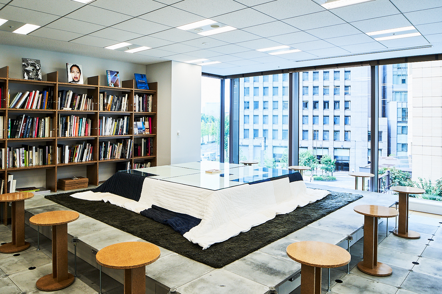 皇居も見えるコーナーに設置したのは、OAフロアでできた小上がりとこたつ。一般家庭で使われるこたつ4個分くらいの大きなサイズです。