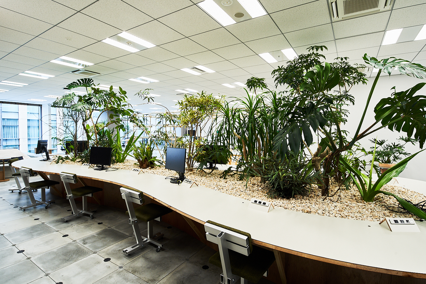 ▲デスクの中央にある大型プランターは、視覚的に遮る役目も。