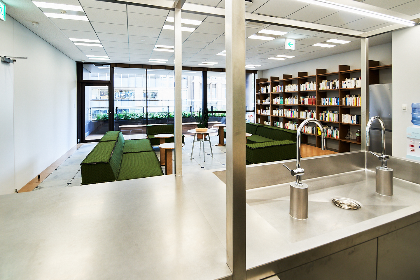 執務室の端には、シンクや冷蔵庫を備えたカフェスペースが。ランチやリフレッシュタイムなどに利用されています。