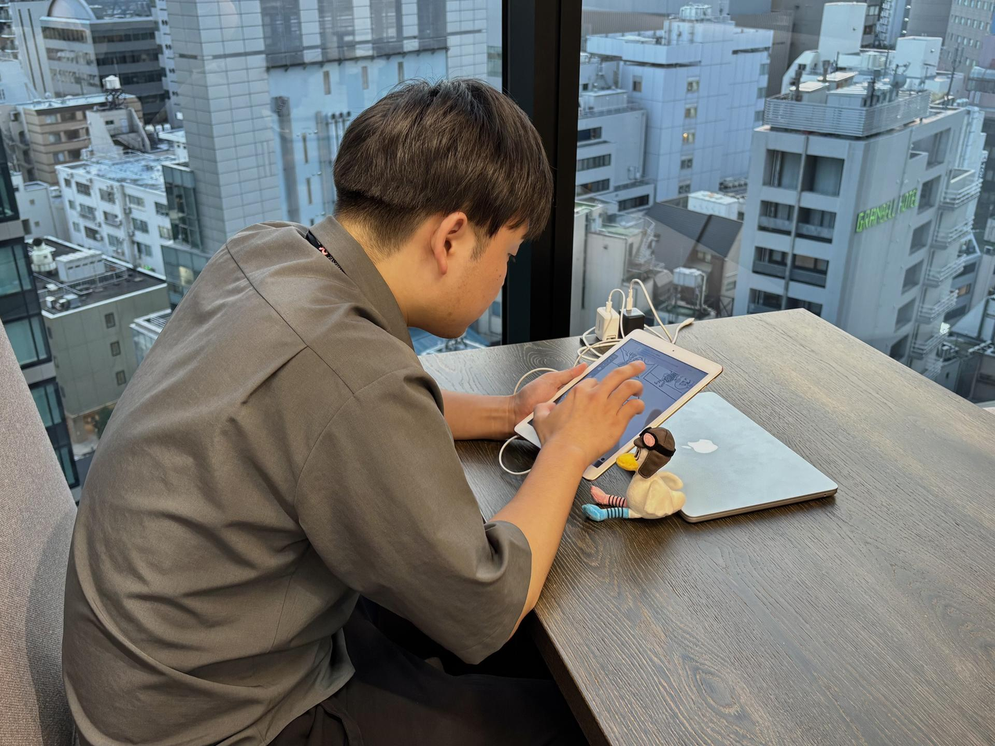 ↑グワグワの漫画を描いている様子。アヒルのぬいぐるみが、GW公式キャラクターのグワグワ