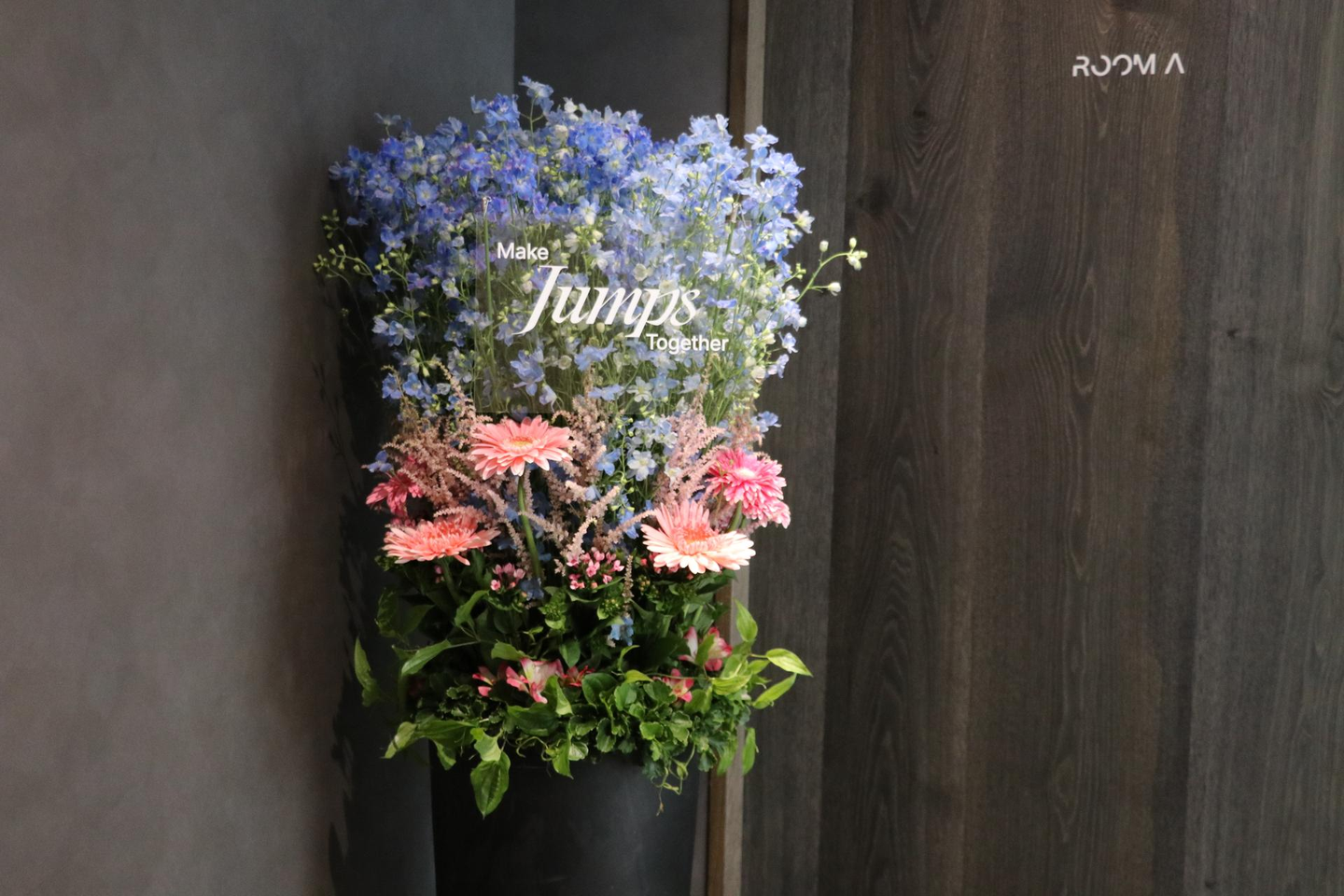 いただいたお花に加えて、訪れてくださる皆さまへのウェルカムの気持ちを込めて、GREAT WORKSのブランドカラーでもある水色とピンクを基調にしたお花も飾っています。