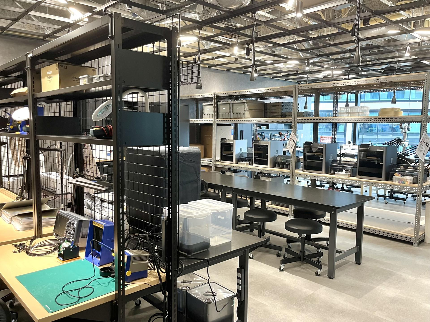ドライラボには、3Dプリンターや加工機械などの最新機器がずらりと並びます。