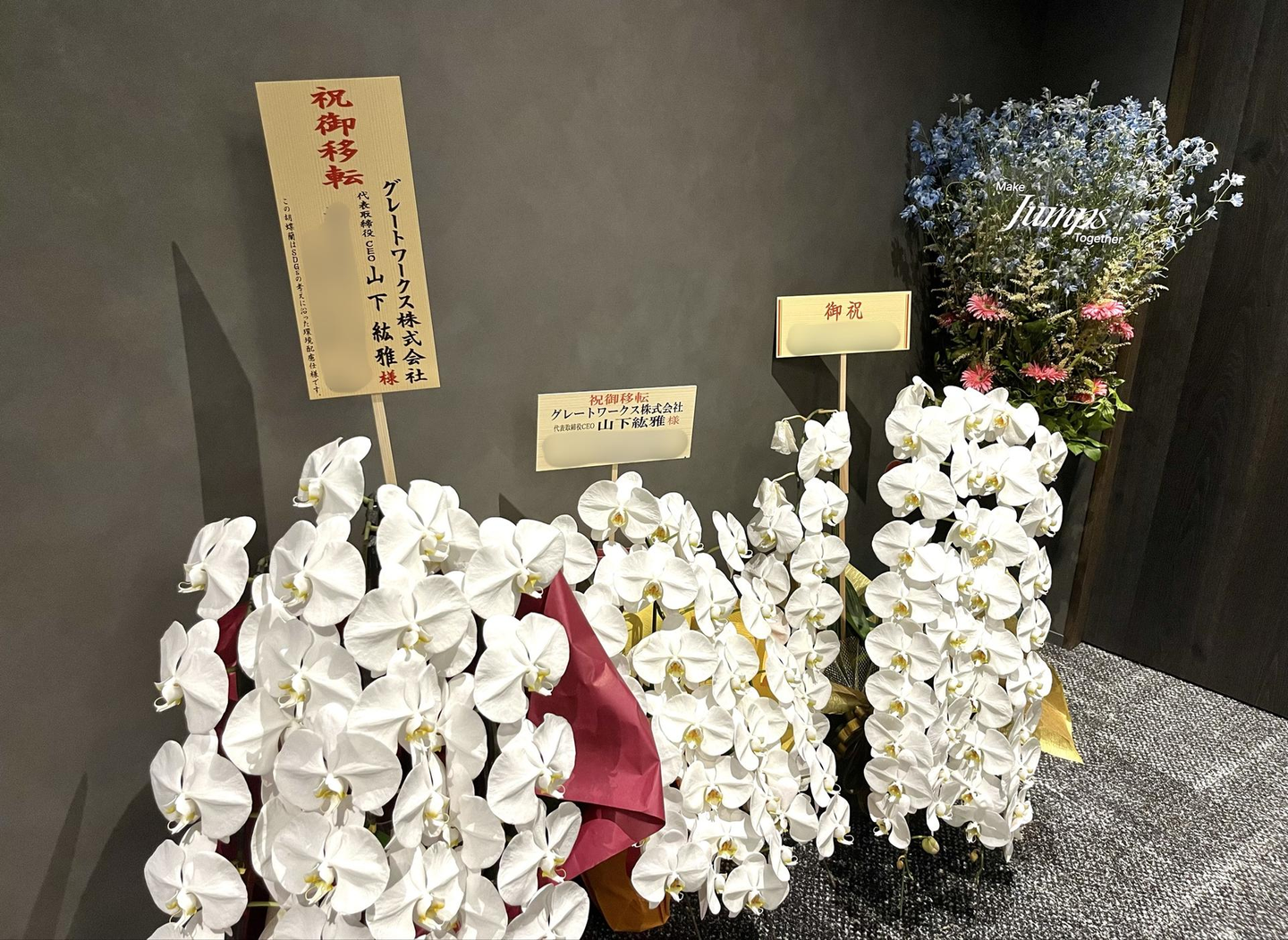 また、移転にあたっては、日頃お世話になっているクライアントやパートナーの皆さまから、お祝いのお花をたくさんいただきました。