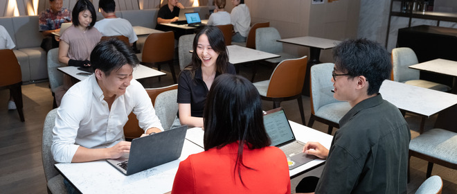 社員・インターン・年齢に関係なく、誰もが挑戦できるフラットな環境が魅力です。成果や意欲が評価され、成長の機会が平等に提供されます。コミュニケーションも役職や国籍を超え、お互いをリスペクトしながらオープンに意見を交わせる文化が根付いています。自ら動き、挑戦することで、誰もが活躍できるフィールドがあります。