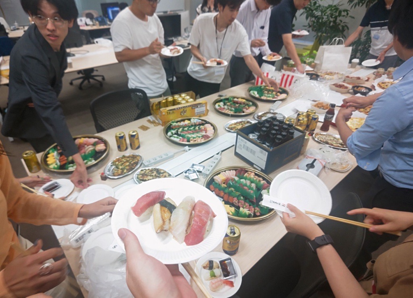 お寿司、ピザ、サンドイッチ、フライドチキン、チヂミなどなど種類も多くあり、皆さん思い思いに楽しんでいます!