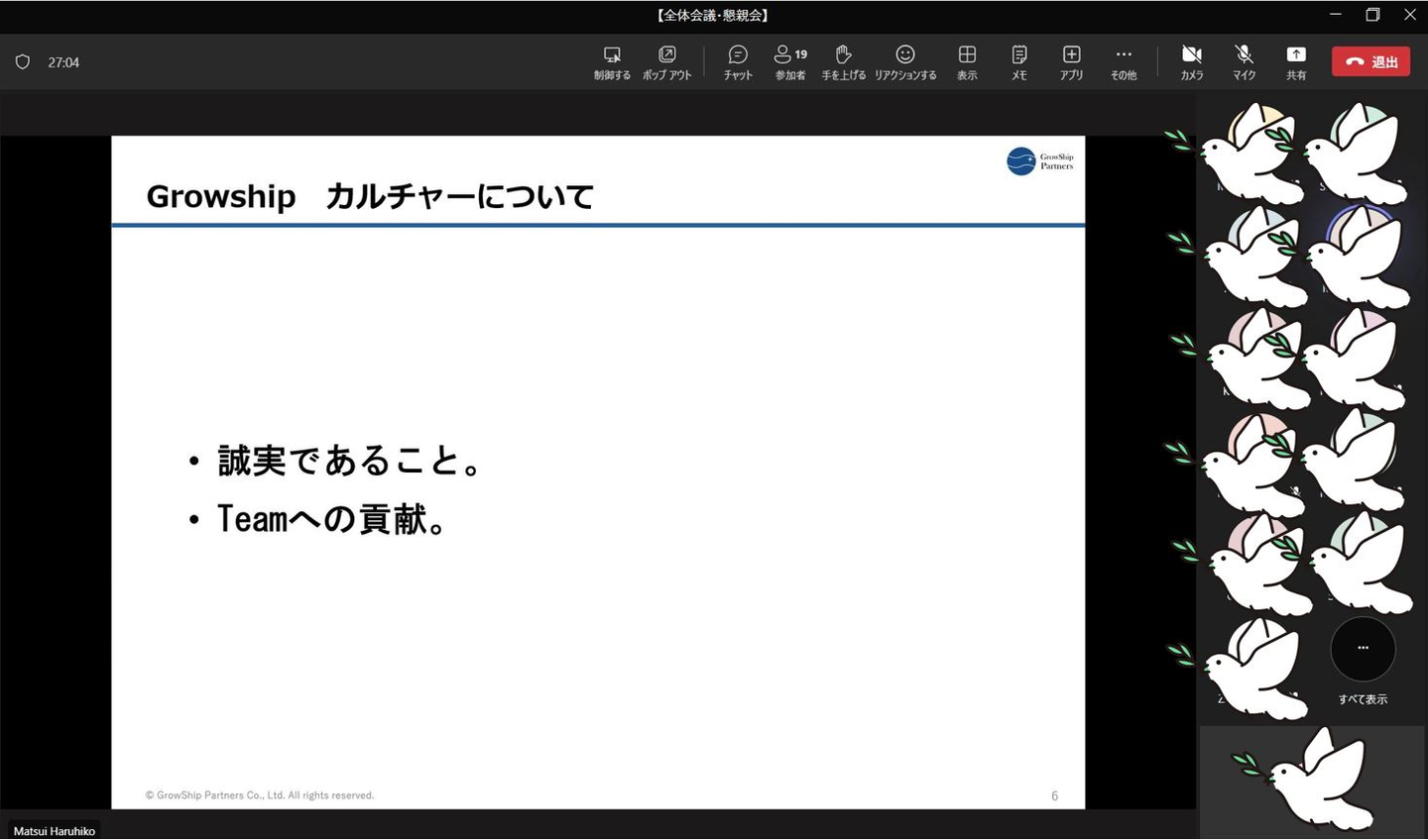 当日は、社長の松井から1年の総括や、当社の今後の方針・展望等の話があり、その後は社員3名ほどが、各プロジェクトについてや、今後の抱負を語ったりします。