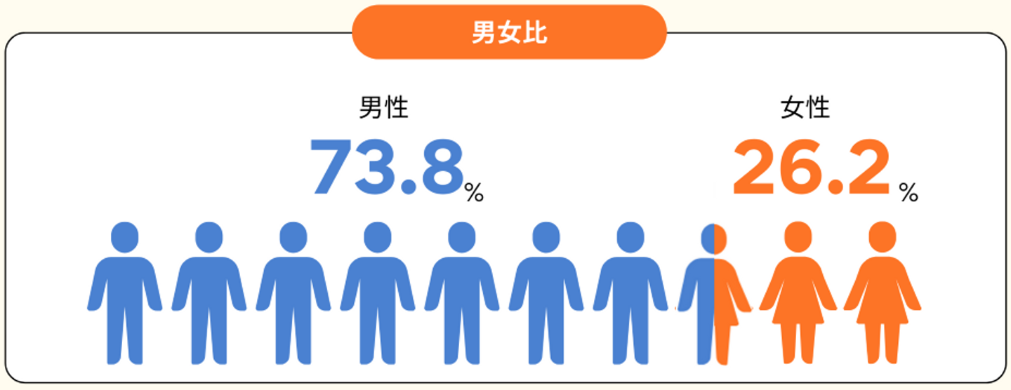 男女比:男性73.8%、女性26.2%