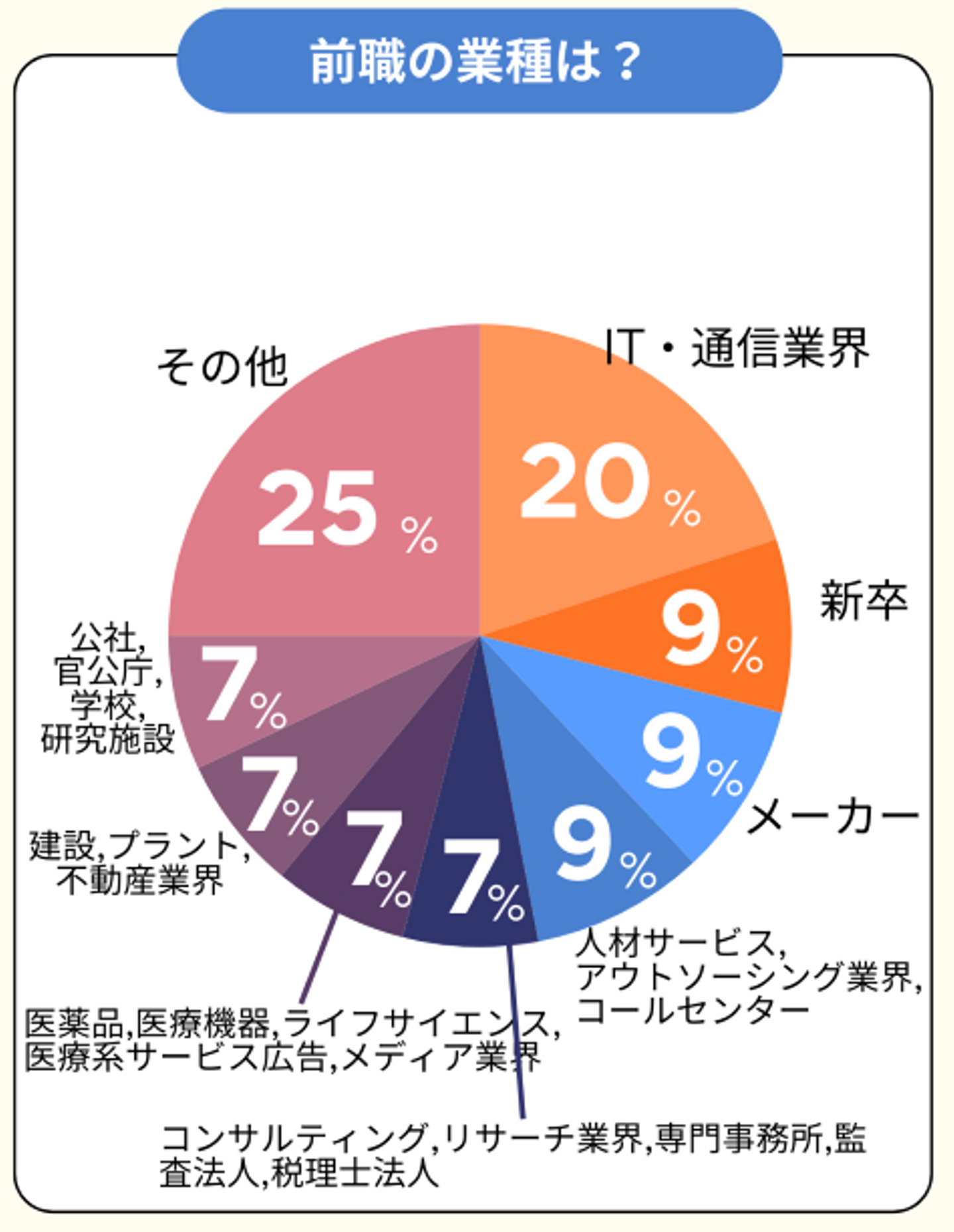 IT・通信業界が一番多く、20%を占めます。次いで新卒入社、メーカー、人材サービス、アウトソーシング業界、コールセンター業界出身が9%ずつを占めております。