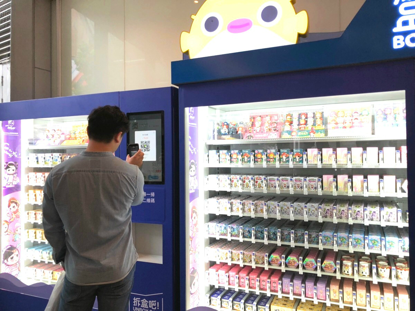 歩行者天国で有名な南京東路沿いでは、Apple Storeが入っている商業施設のエントランスにて面白いシステムを見つけました。今中国でトレンドになっているキャラクターグッズの自販機です。ちょうど購入する方がいたので撮影させていただきました。なんとこちらも支払い方法はQRコードのみで、現金支払いには対応していないとのことでした。