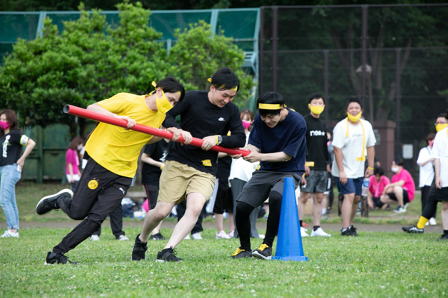 台風の目では、3人1組で固定されたコーンを回ります。棒から手が離れたらやり直し…。内側を回る人、外側を回る人のスピード調整が勝利のカギとなりました。