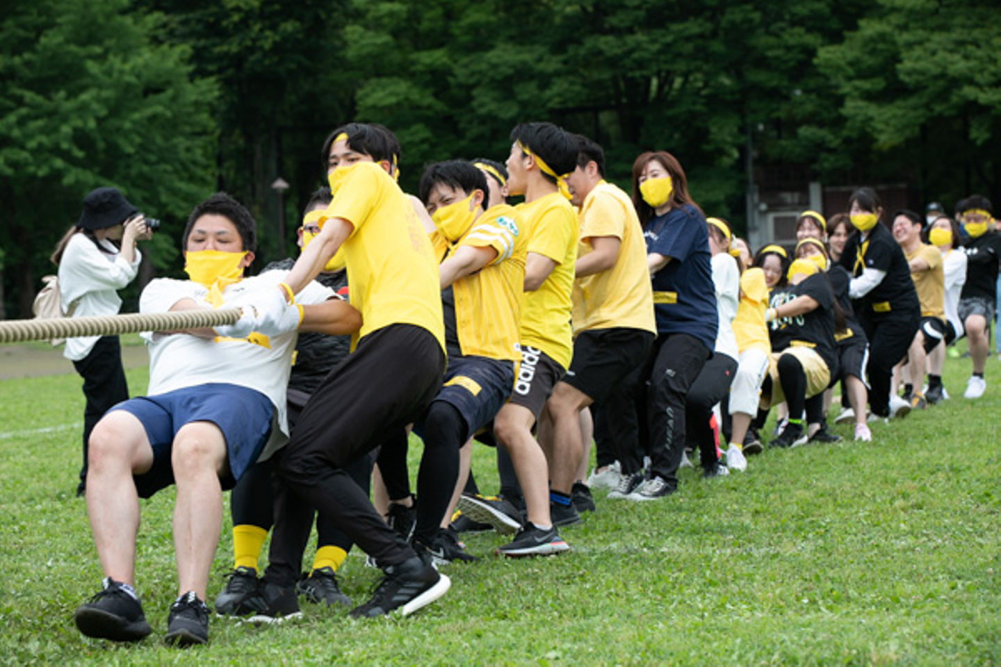 競技もいよいよ終盤。恒例の綱引きはチーム力を爆発させるために、綱の引き方や並び順など各チーム密に話し合います。持てる力を振り絞って懸命に綱を引きます。