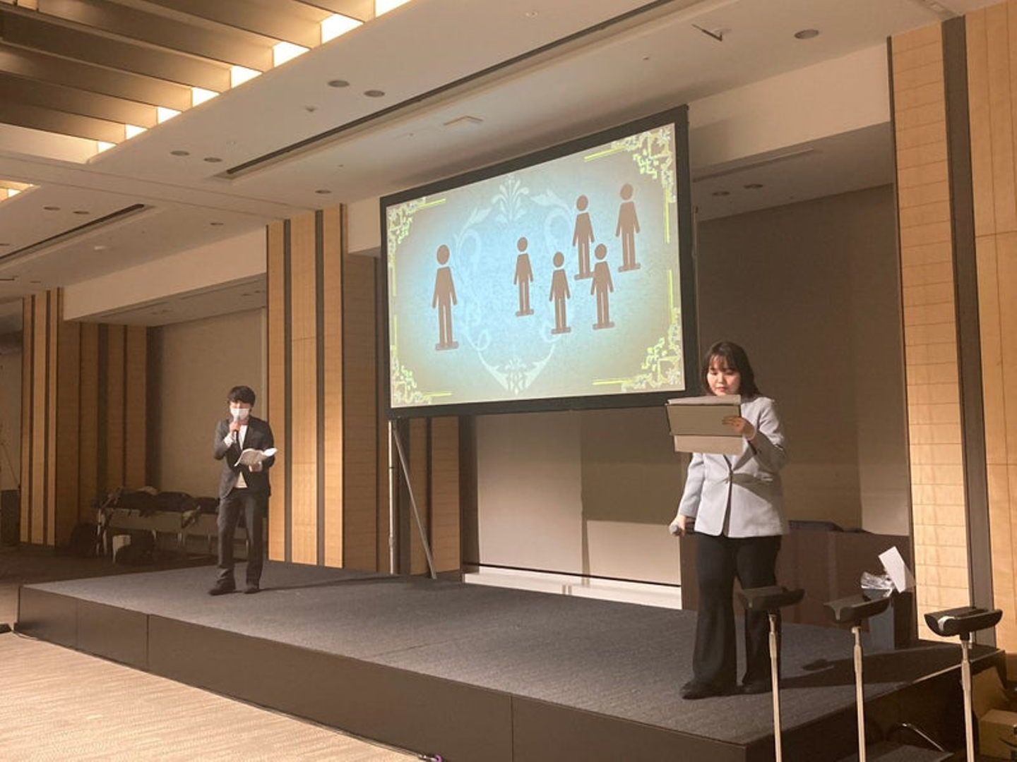 3年ぶりに全社で集まった盛り上がりが早くもピークを迎える中、今年の4月より博展に仲間入りした新入社員による自己紹介。キャリア入社の皆様の紹介の後に続き、私たちがステージに上がりました。新人がステージにいるときも、田口さんをはじめとした社員の方々の歓迎の拍手が嬉しく、緊張が一気にほぐれました!