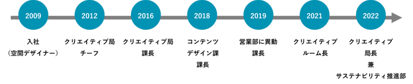 2019年に営業部の課長になり、主にtoC系の大手スポーツメーカーなどを担当して、その後、オリンピックが終わったあと、再びクリエイティブにルーム長として戻ることに。今期の4月からは、局長というポジションになるとともに、サステナビリティ推進部にも兼務で所属しています。