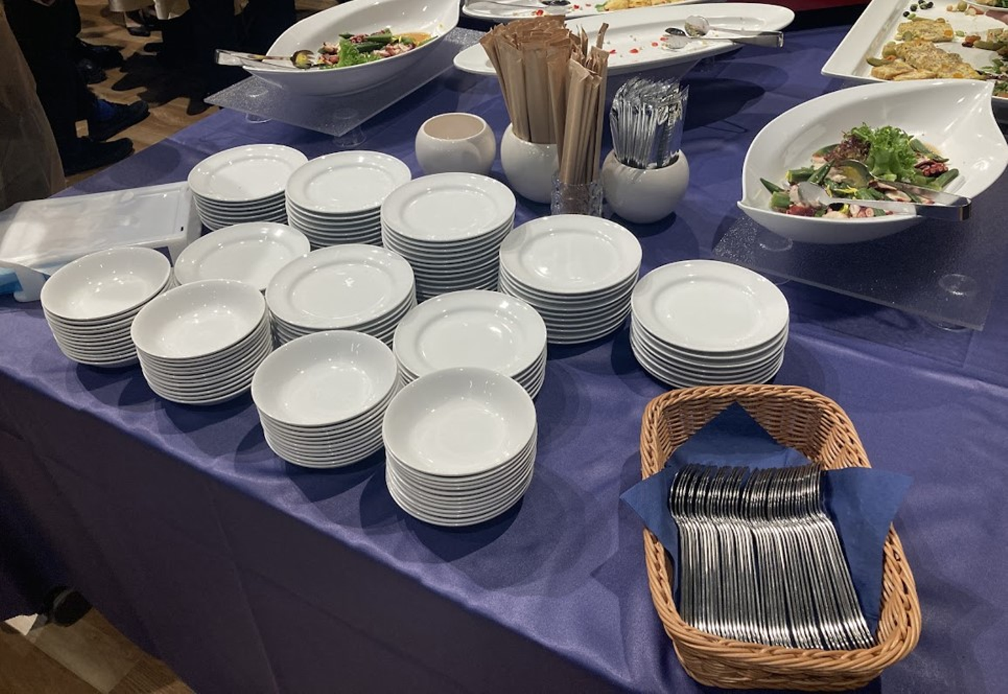 懇親会では、使い捨てプラスチック削減のため、陶器のお皿やシルバーのカトラリーを採用しました。