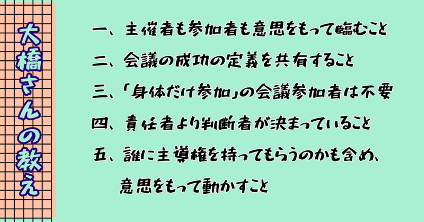 大橋さんの様々な「会議の極意」は、特に会議に参加する側、プロジェクトメンバー側の姿勢としての具体的なアクションが印象的。特に「会議の成功は主催者だけではなく、関わる全員の責任」というのが心に沁みました。