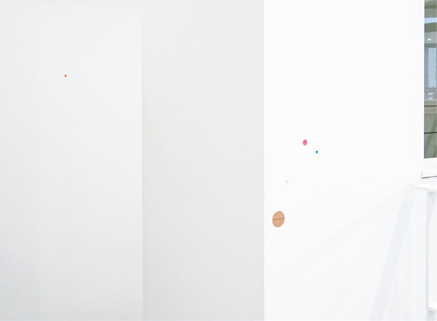 2回目のオープンスタジオの告知は、小さな丸シールを紙コップやトイレのドア、階段の手すりなど、社屋の様々な場所に散りばめて貼られた。