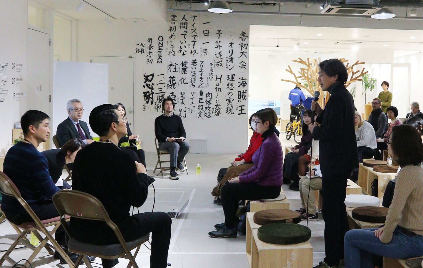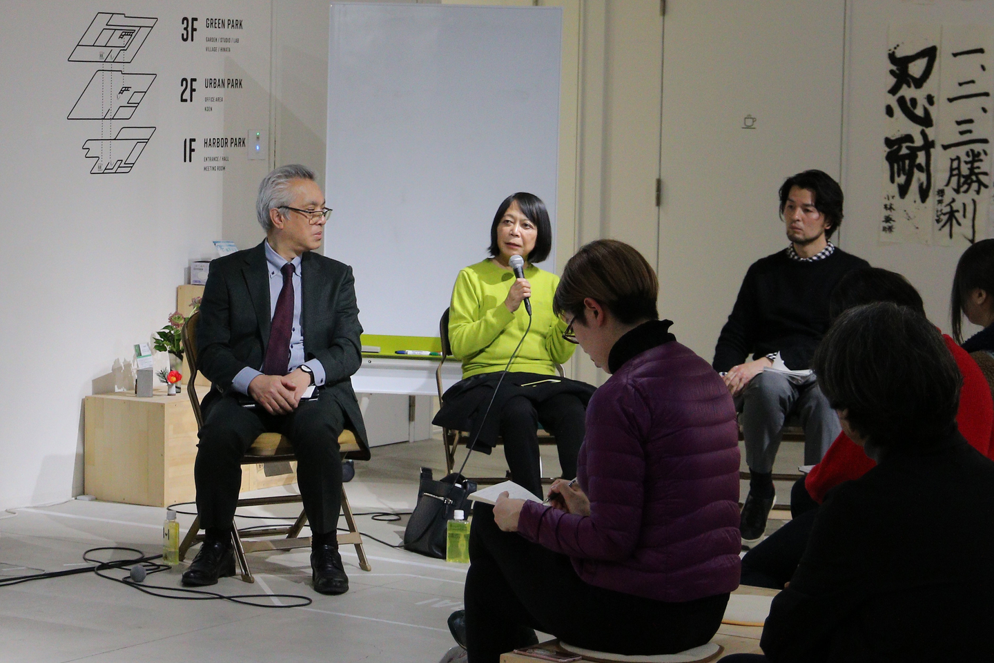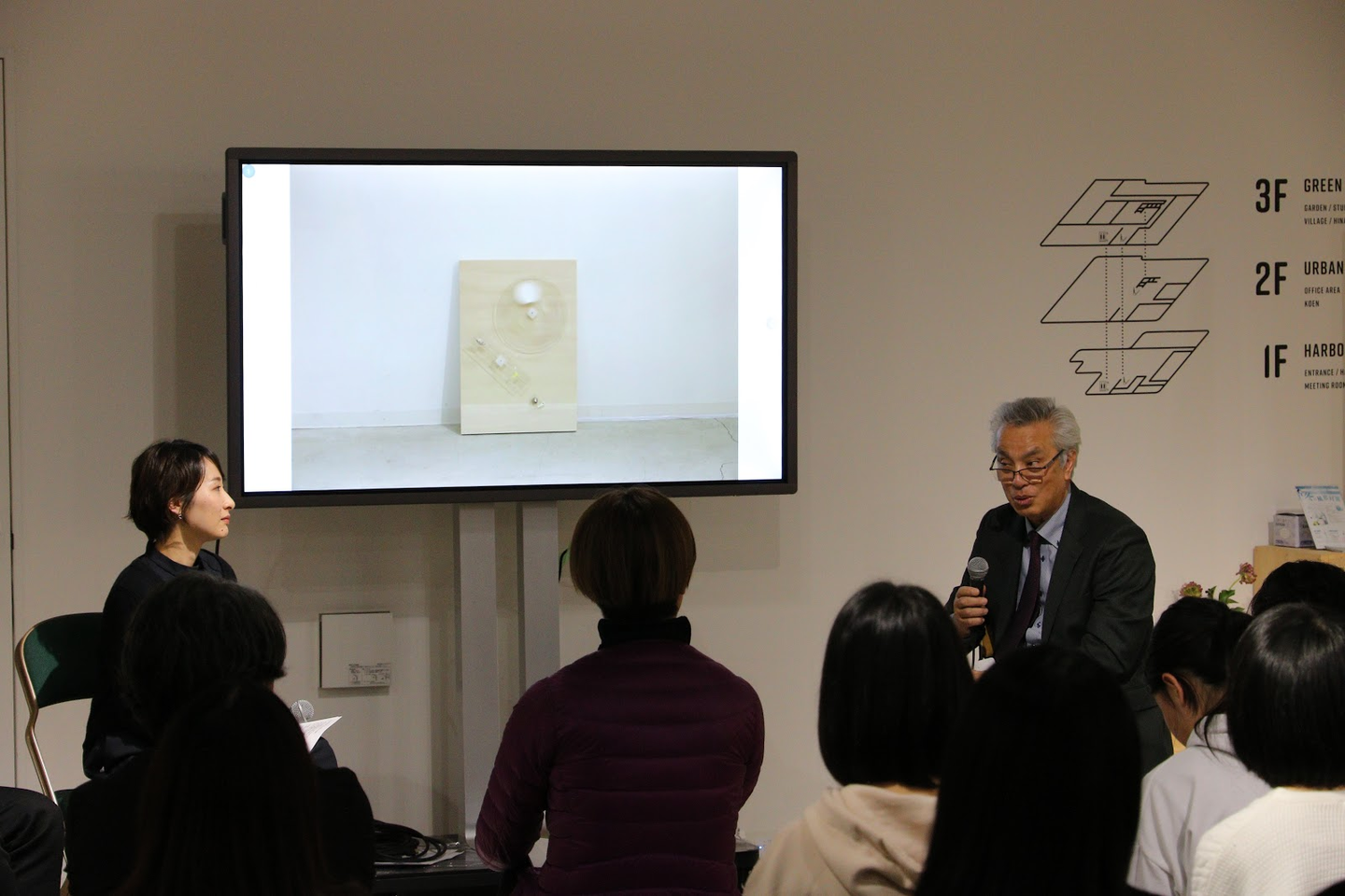 観客席:「会社に3ヶ月もアーティストが滞在して何かを生み出すシチュエーションに物凄く驚いて感銘を受けている。ぜひ続いて欲しいと思っています。今回は社内での開催でしたが、今後は小田原市内に核を増やすなど、アーティスト・イン・レジデンスに限らず広げいていく視野はお持ちですか?」
