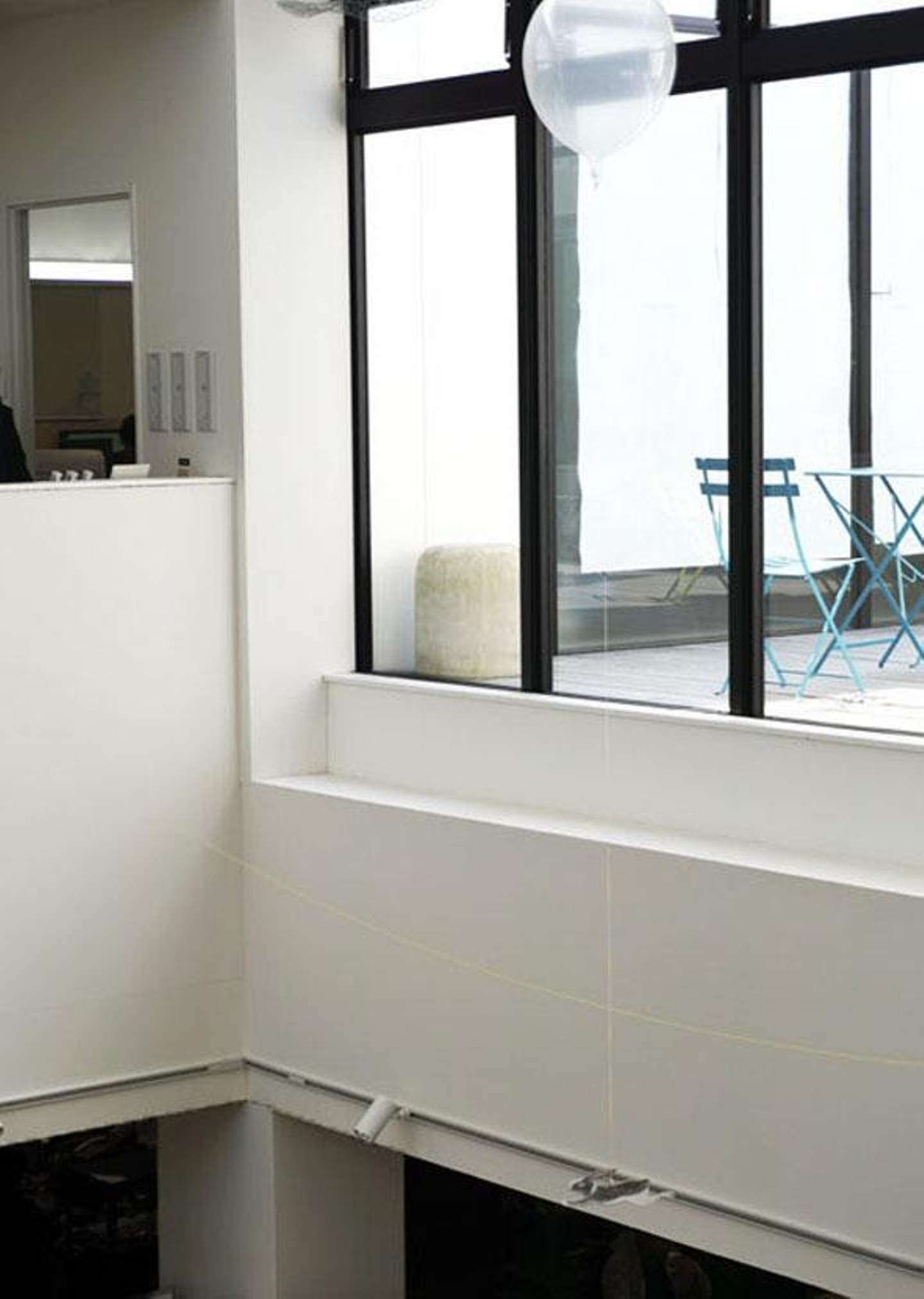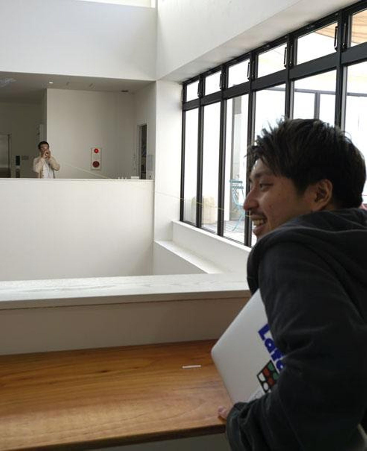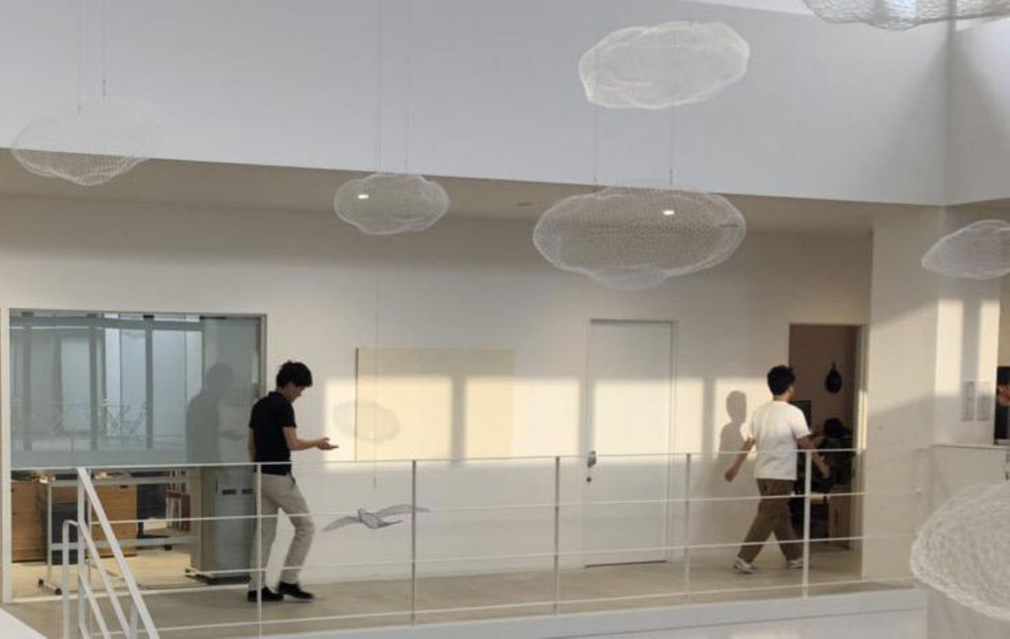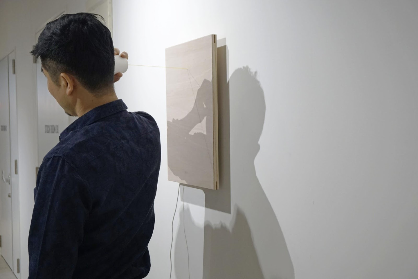 音羽:「糸を長くして吹き抜けの反対側にいる人と話せるようにしました。特に何か深い意味があってやったことではなかったですが、不便であること・不自由であることに興味があります。便利であることは、たくさんのことを素早く知るのに役立つかもしれないけれど、私たちが何かしらの不便さ、合理性を欠いてる状態のときこそ1つのことを深く「確かに知る」ということへの扉が開くんじゃないかという意識があります。実際に設置してみて、対岸に走っていって紙コップを手に取ることだったり、相手が話し終わったのを確認してる間があったり、糸の引き具合をお互い言葉なしで調節し合ったり、お互いの会話する意思みたいなものが可視化されているという印象があって…それがなぜか照れ臭く感じるのが興味深かったです。」