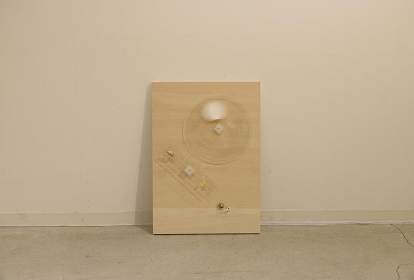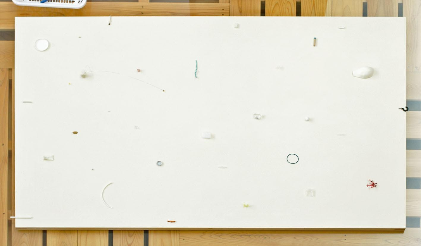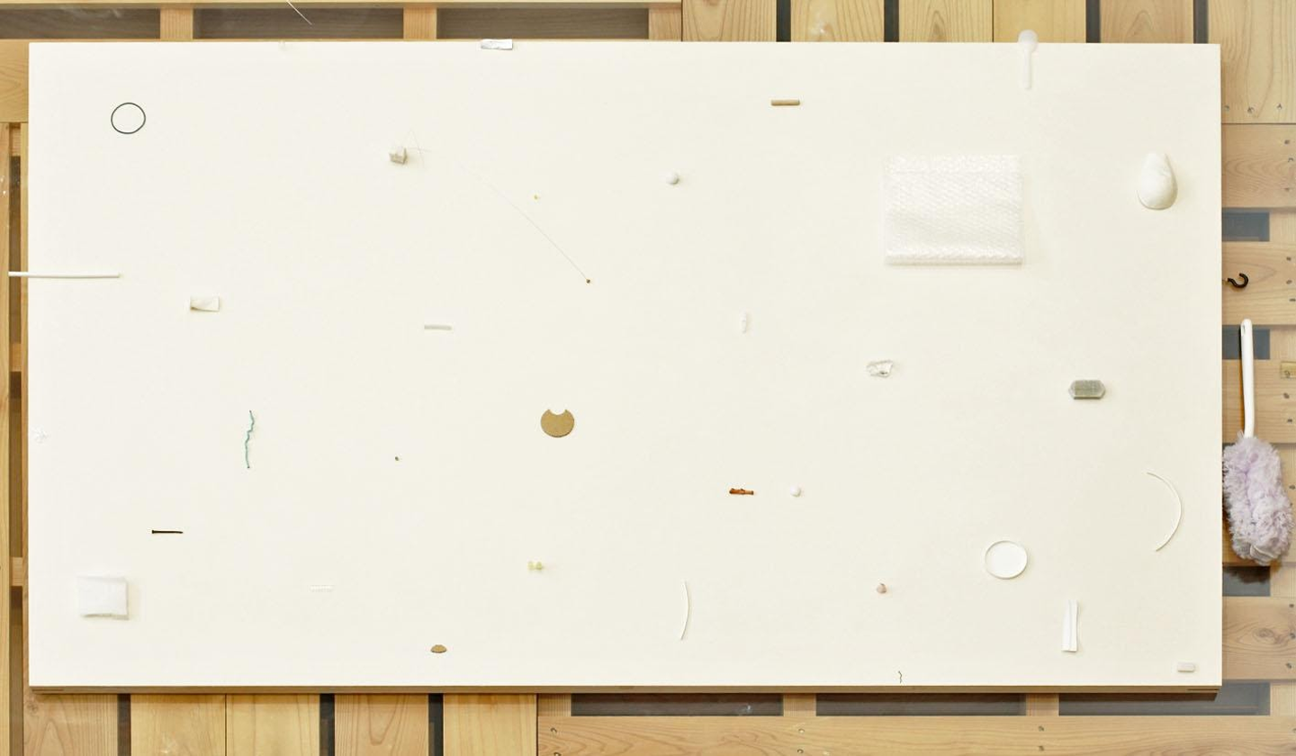 菊竹:「新入社員が入るタイミングでスタートさせたAIR in Hameeは、音羽さんのように日常の素材をうまく使っていくプロセスを見ることは、いわゆるアーティストやアートに触れてこなかった人たちにとても理解しやすいのではないかと思った。その中で糸電話だったり双眼鏡だったり、ロッカーなど、社員の方とのコミュニケーションを積極的に有効に制作していきながらも、最終的に構成物を取り除いた真っ白なキャンバスを出したことに、鑑賞者とちょっと距離をとっている印象を受けた。最後にそこに着地した気持ち、なぜキャンバスの上に色々置いていたものを取り除いたのかを聞いて見たい。」