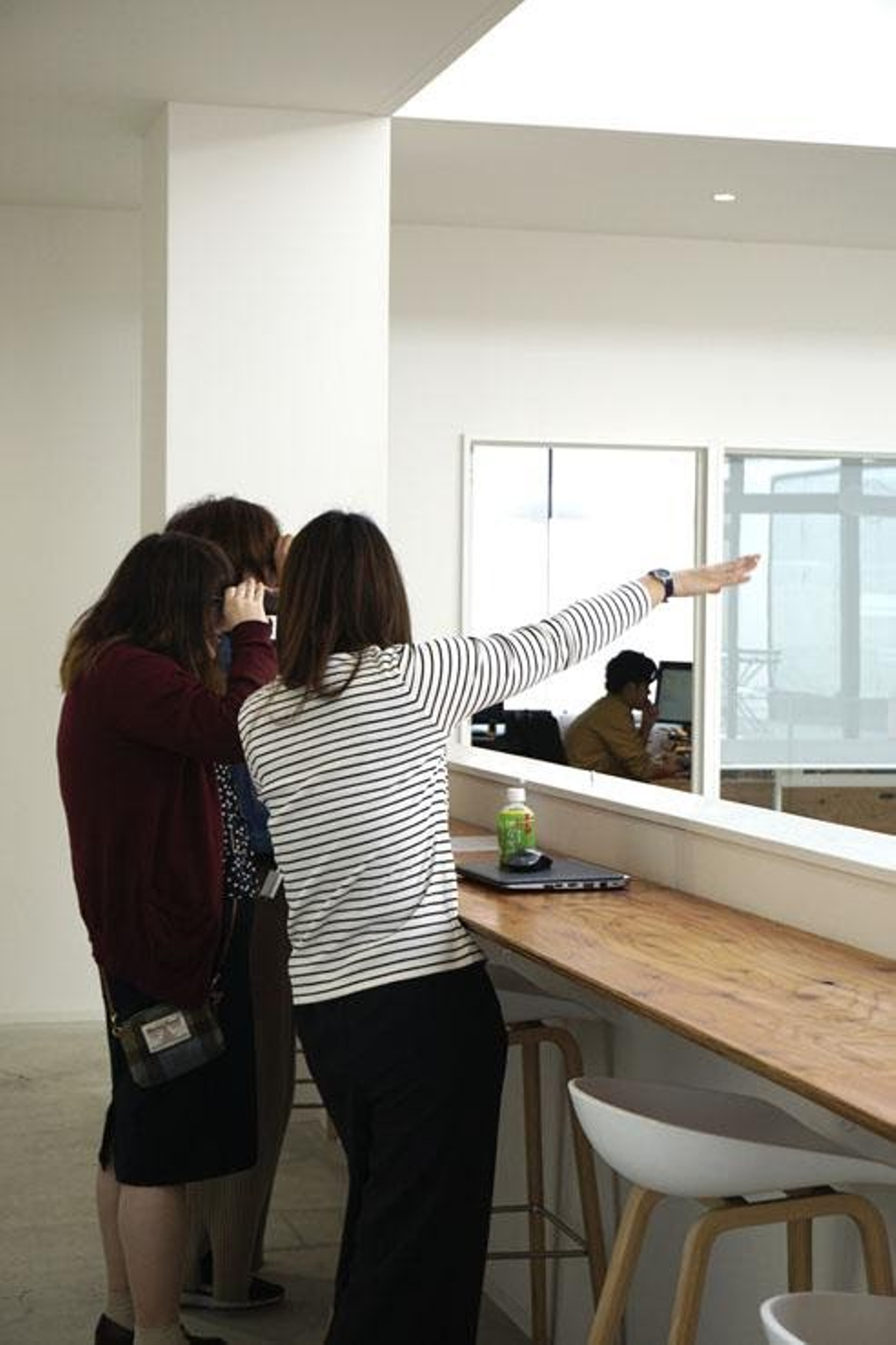社員の有志が小さな絵を製作し、吹き抜けの壁に飾って、対岸から双眼鏡で鑑賞する様子。